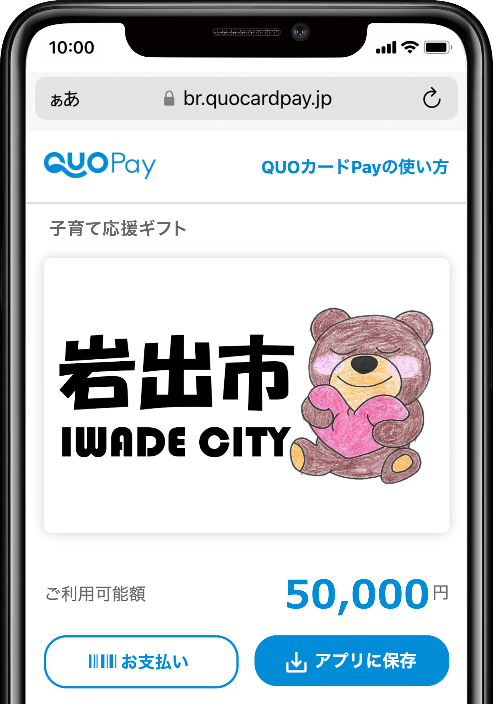 妊娠届出時に「出産応援給付金」として5万円相当、出生届出後に「子育て応援給付金」として子ども一人あたり5万円相当の「岩出市出産・子育て応援専用QUOカードPay」を支給します。