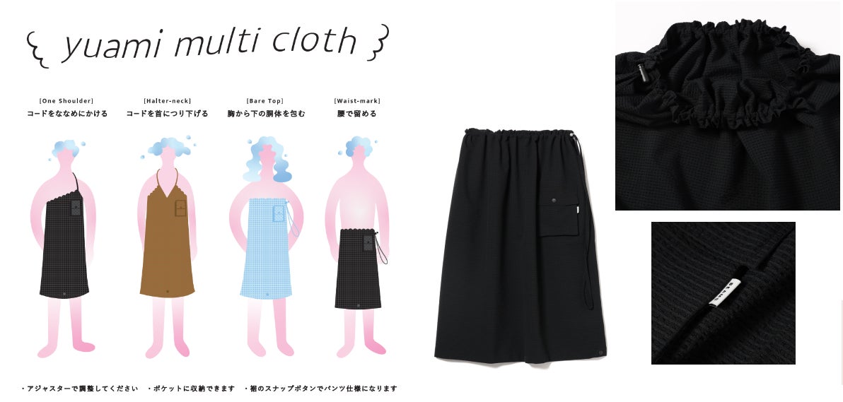 今回、BEAMSにて開発された湯浴み着は、「yuami multi cloth」と「yuami bag」の2種類です。身に着ける方が、露出のボリューム、ラインの好みはもちろん、体のカバーしたい部分にあわせてセレクト可能です。