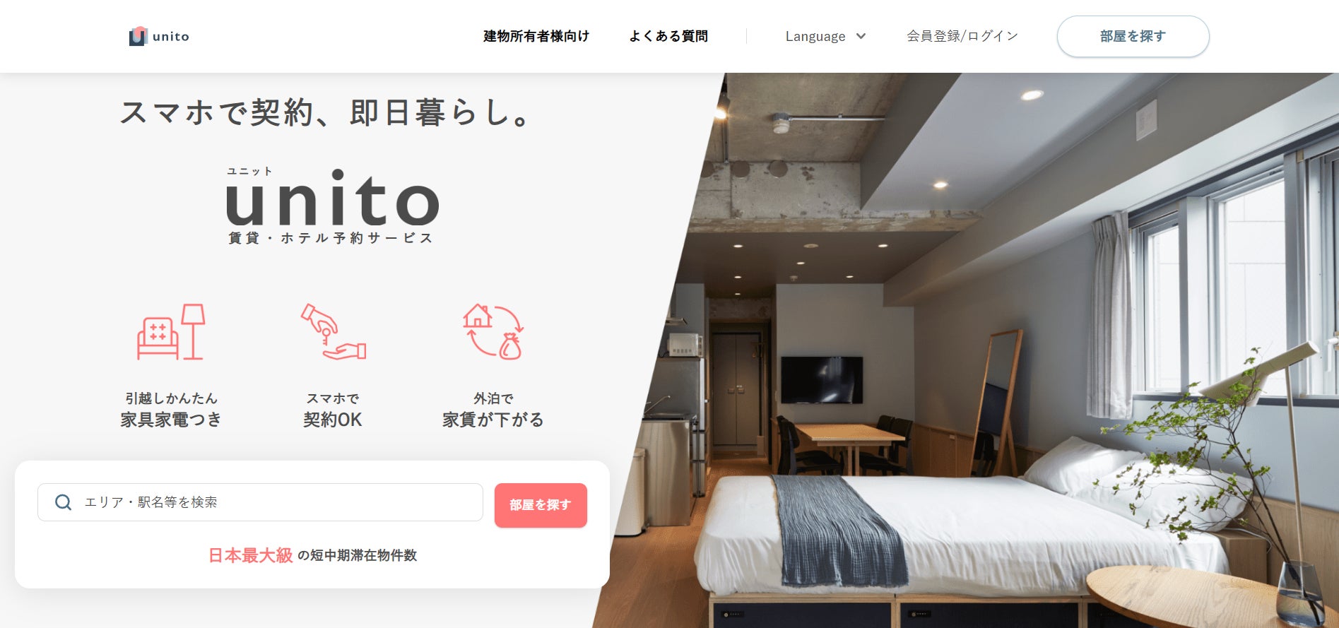 「暮らしの最適化の追求」を掲げ、帰らない日は家賃がかからないホテル・サービスアパートメントの企画・開発・運営、オンラインで契約完結・最短即日で住むことができる暮らしのプラットフォーム「unito」を開発・運営しています。支払う家賃が ”住んだ日数分” だけになる、当社独自のビジネスモデル「リレント(Re-rent)」を軸に、暮らしの最適化を追求していきます。