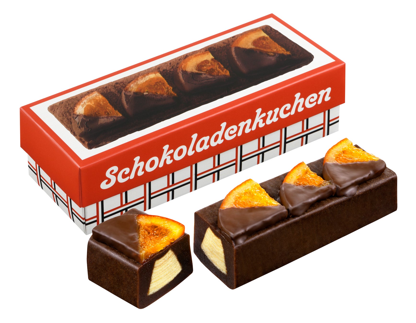 バウムクーヘンを中に閉じ込めた濃厚で滑らかな食感のチョコレートケーキはユーハイムならでは。生地には、カカオ分60%のスイス産ダークチョコレートを使用しました。ほろ苦いチョコレートと、天面に飾った甘酸っぱいオレンジの組み合わせも抜群です。