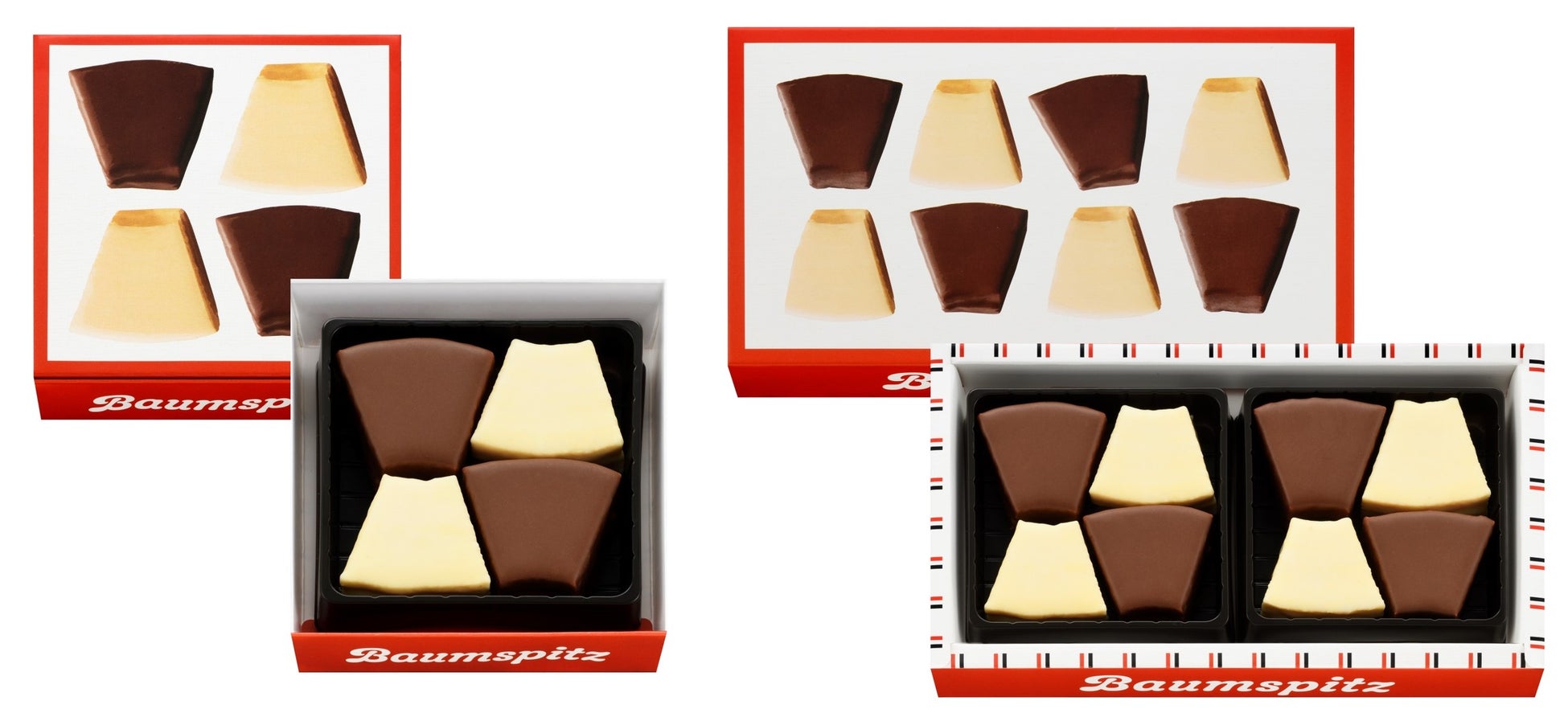 ひとくちサイズのバウムクーヘンにジャムをサンドして、チョコレートで包んだロングセラーの季節商品。アンズジャム×ホワイトチョコレートと、クランベリージャム×ミルクチョコレートのアソートです。