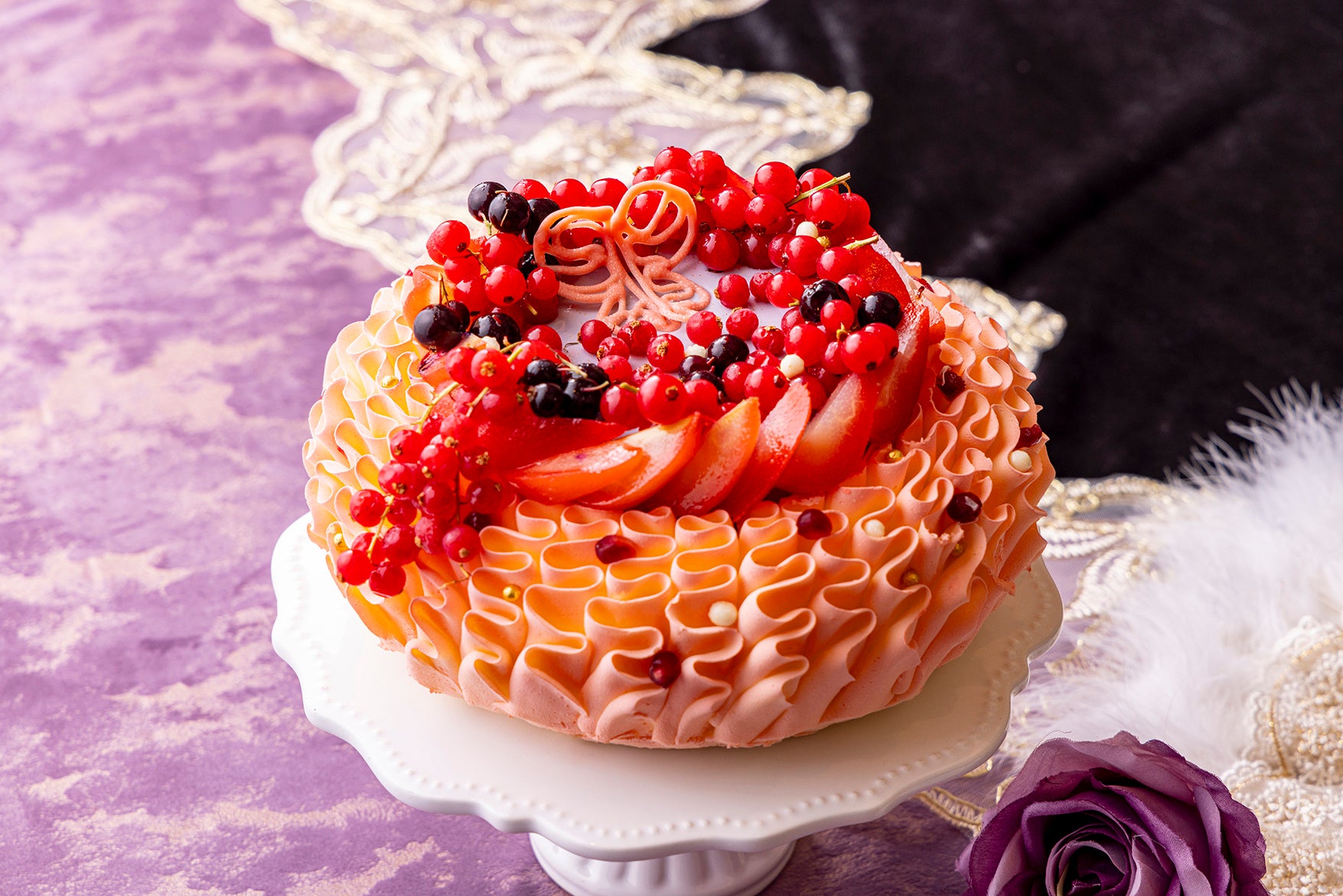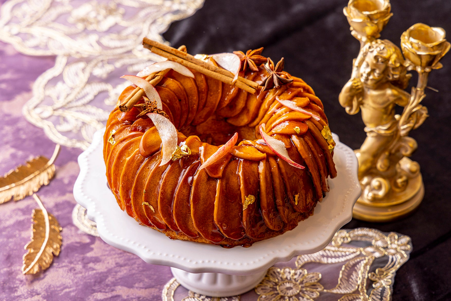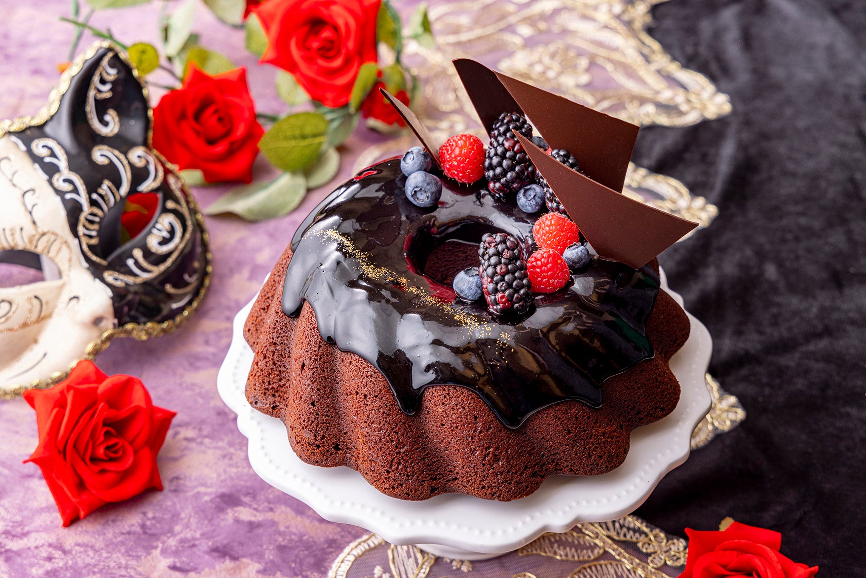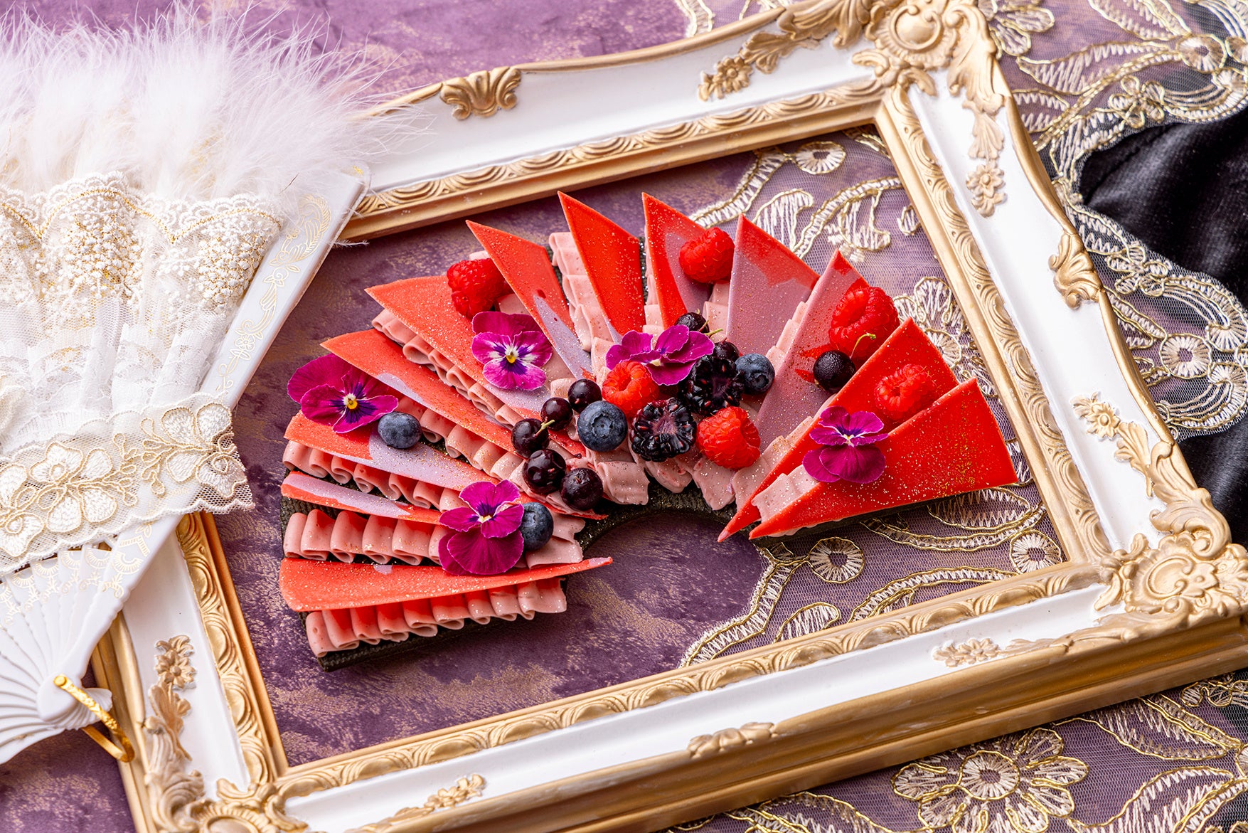 まるで扇のようなフォルムが美しい「レヴァンタイユ」は、ラベンダー風味のルビーチョコレートのクリームにバルサミコ酢で和えたラズベリー、ブルーベリー、ブラックベリーとエディブルフラワーをトッピング。マリー・アントワネットのお輿入れの際にオーストリアから持ち込まれたと言われるクグロフをベースにした「マスク・ノワール」は、洋梨リキュールに付け込んだドライフルーツとローストしたピーカンナッツがアクセントになったしっとりとした味わいに仕上がっています。