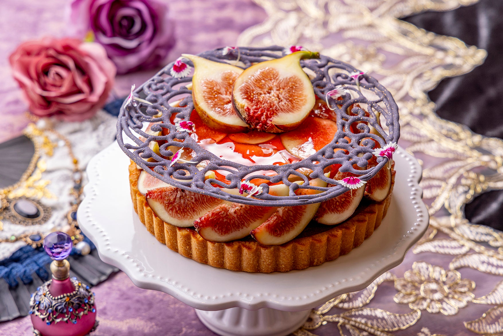 高貴な蘭の香りをまとった青リンゴと洋梨のムースの中にグロセイユとストロベリーのコンフィチュールを忍ばせた「マント・ド・クール」は幾重にも重なるドレスの裾をイメージした愛らしい一品です。クリームチーズタルトの上にグァバと無花果入りホワイトチョコレートのムースとはちみつでマリネしたフレッシュ無花果を配し、繊細なチョコレート細工がエレガントな「ビジュー・ロトンヌ」は王妃が秋に纏う宝石をイメージしました。