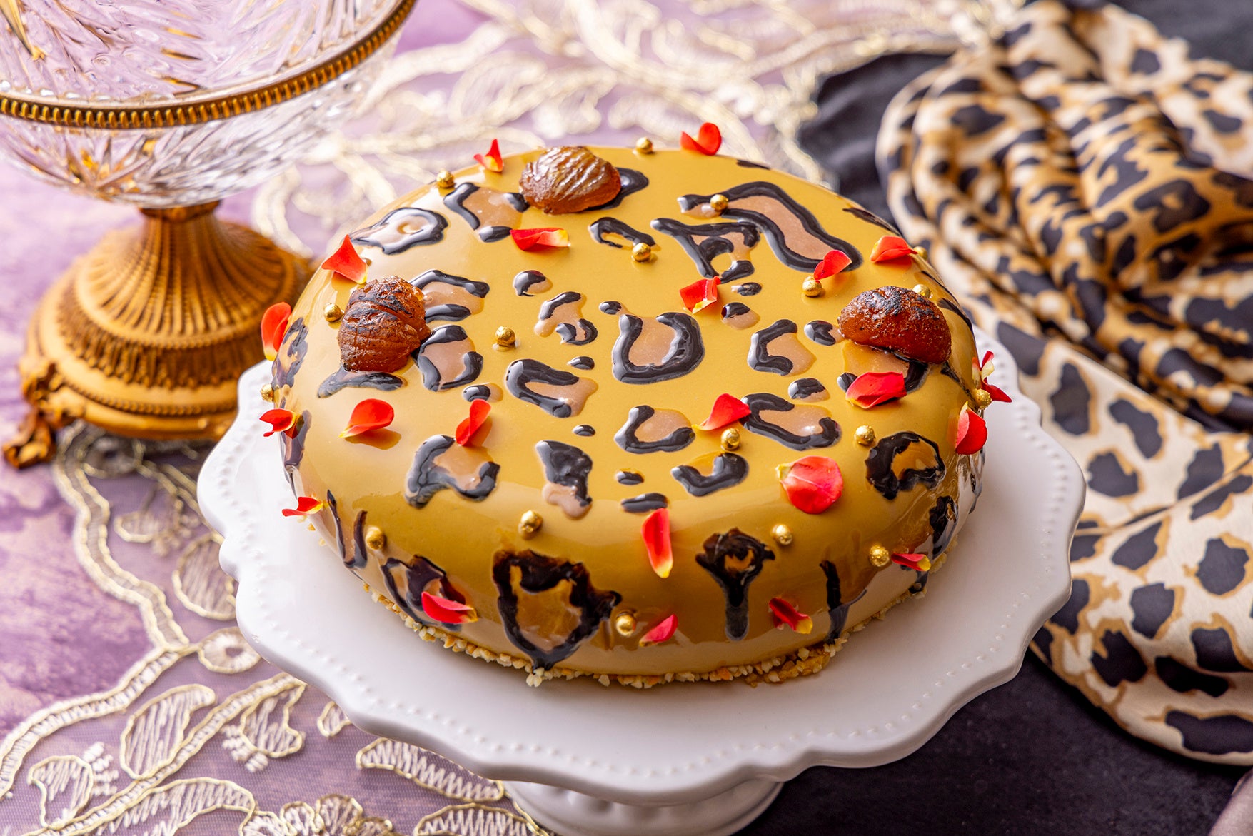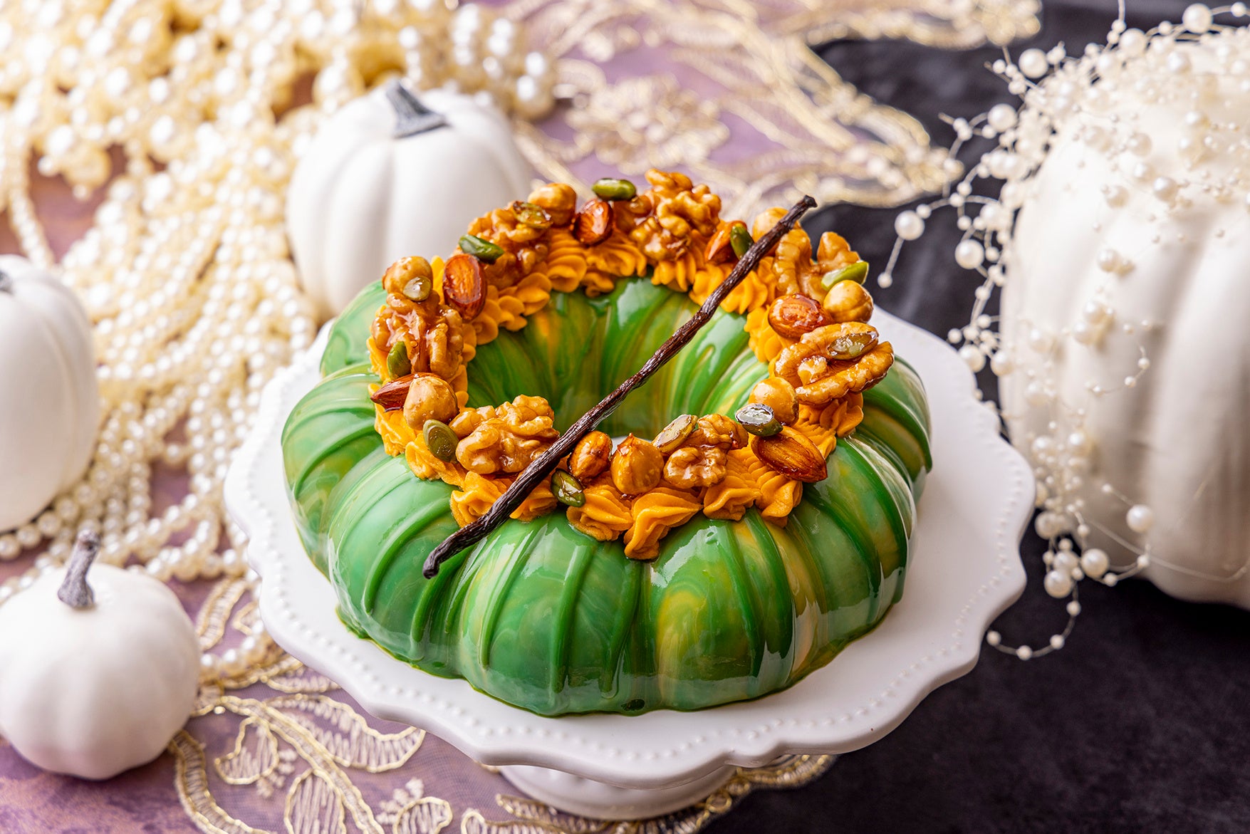 王妃が特に親しい友人だけを招き入れた秘密のサロンで振舞われるスイーツも見逃せません。眠気覚ましのコーヒームースをチョコレートムースで覆い、焼きマロングラッセとローズをトッピングした「王妃のネグリジェ」、ヘーゼルナッツプラリネのムースの中にパンプキンクリームトとローストしたパンプキンシードを配したかぼちゃのケーキ「プティ・ポティロン」はキャラメリゼしたアーモンドやヘーゼルナッツのザクザク食感がアクセントに。