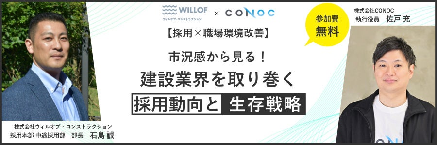 | プログラム | 13:30-13:35 挨拶・登壇者紹介 13:35-14:00 施工管理の採用市場の現状と課題(ウィルオブ・コンストラクション) 14:00-14:25 限られたマンパワーで業務を回す戦略(CONOC) 14:25-14:30 お知らせ |