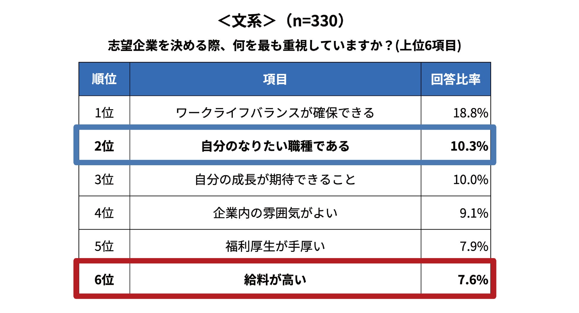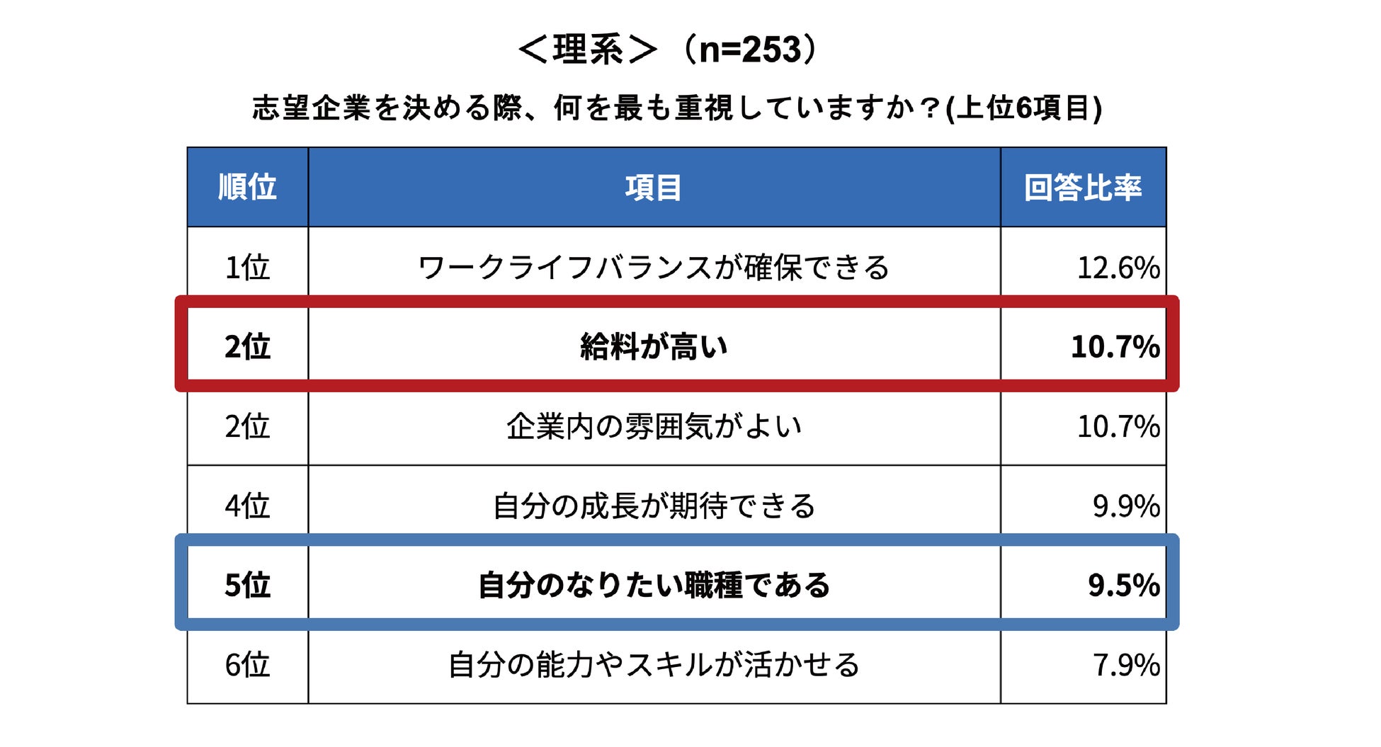志望企業の選び方について、文系は「なりたい職種」、理系は「給料」を重視