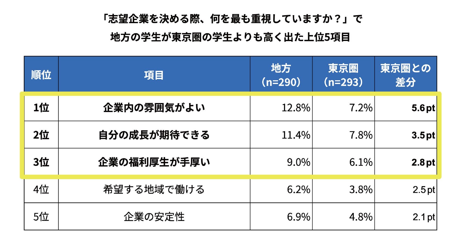 一方で地方在住の学生は「企業内の雰囲気がよい」ことを東京圏の学生よりも重視しており、次いで「自分の成長が期待できる」、「企業の福利厚生が手厚い」の順となりました。