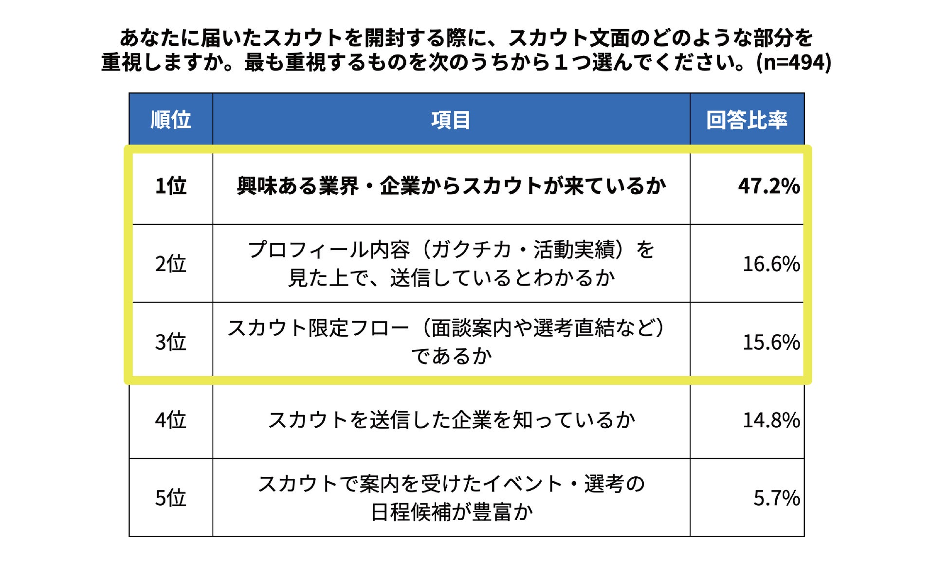 スカウトを開封する上で最も重視している点は「興味のある業界・企業からスカウトがきているか」(47.2%)で1位となりました。次いで「プロフィール内容(ガクチカ・活動実績)を見た上で送信しているとわかるか」(16.6%)、「スカウト限定フロー(面談案内や選考直結など)であるか」(15.6%)となり、自分を理解して書かれた、次のステップへ進める特別なスカウトであるかが開封の鍵となっているようです。