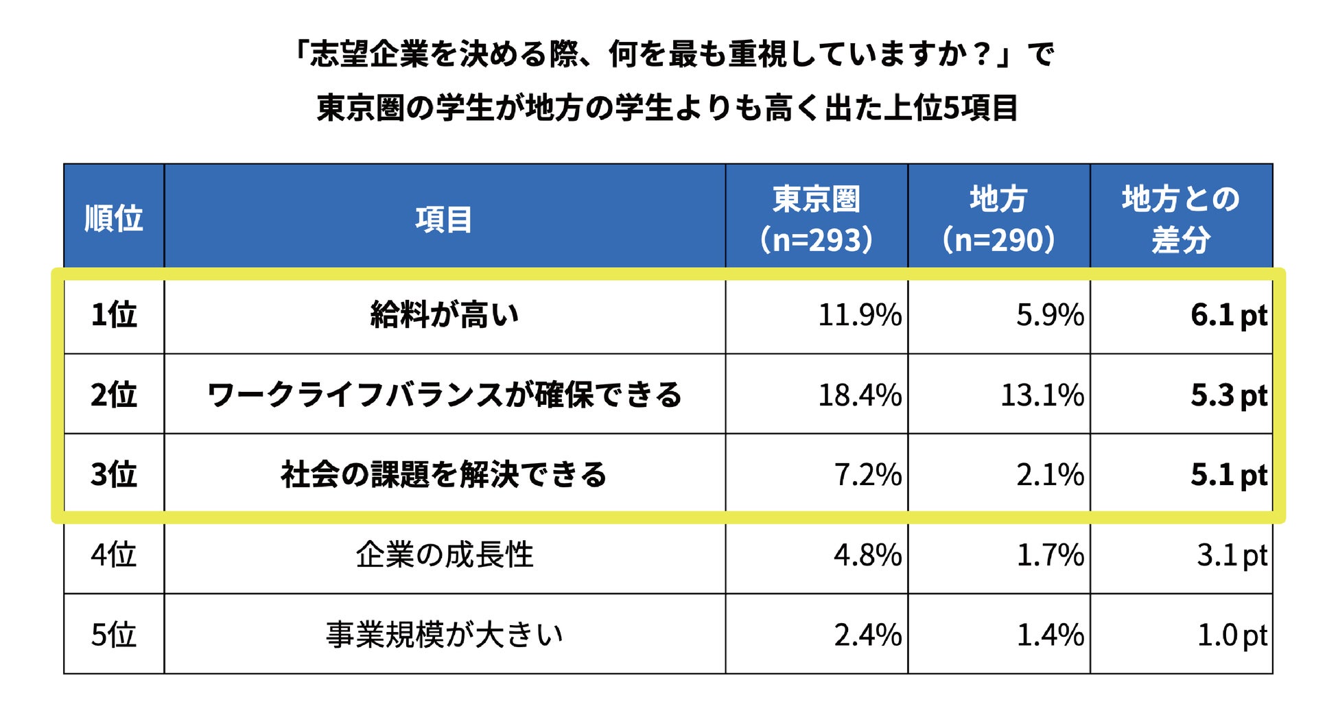 東京圏の学生は企業選びで「給料・ワークライフバランス・社会課題の解決」を、地方学生は「企業内の雰囲気・自己成長・福利厚生」をより重視