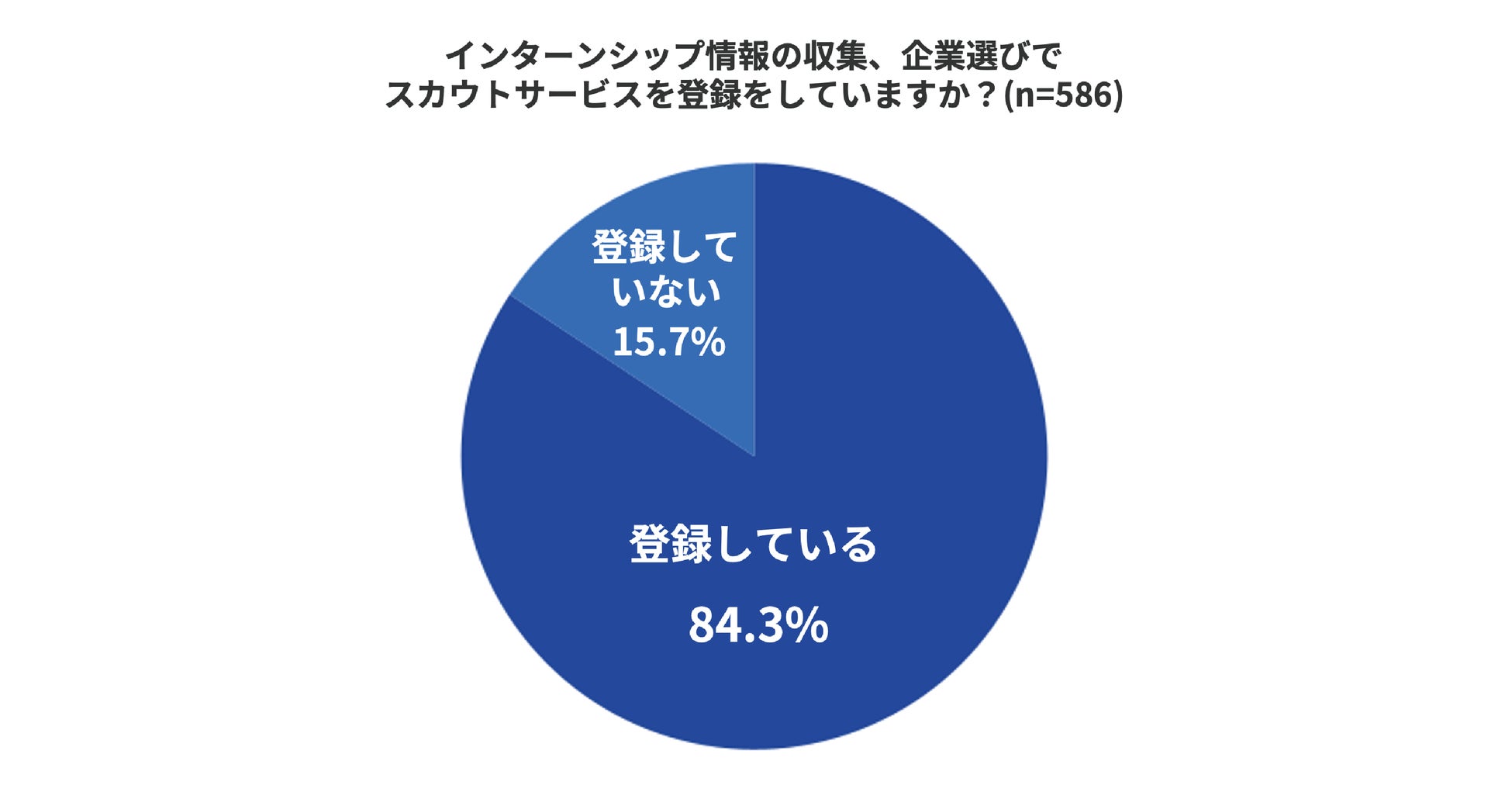インターンシップ情報の収集や企業選びでスカウトサービス(逆求人サイト)を登録しているかを尋ねたところ、84.3%が「登録している」と回答しました。