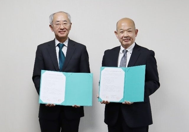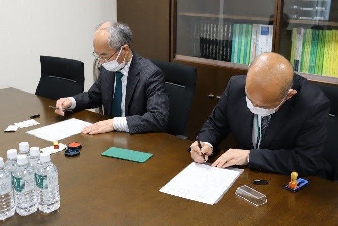 調印式に臨んだ鵜浦外国語学部学部長(左)と小椋第六中学校校長(右)