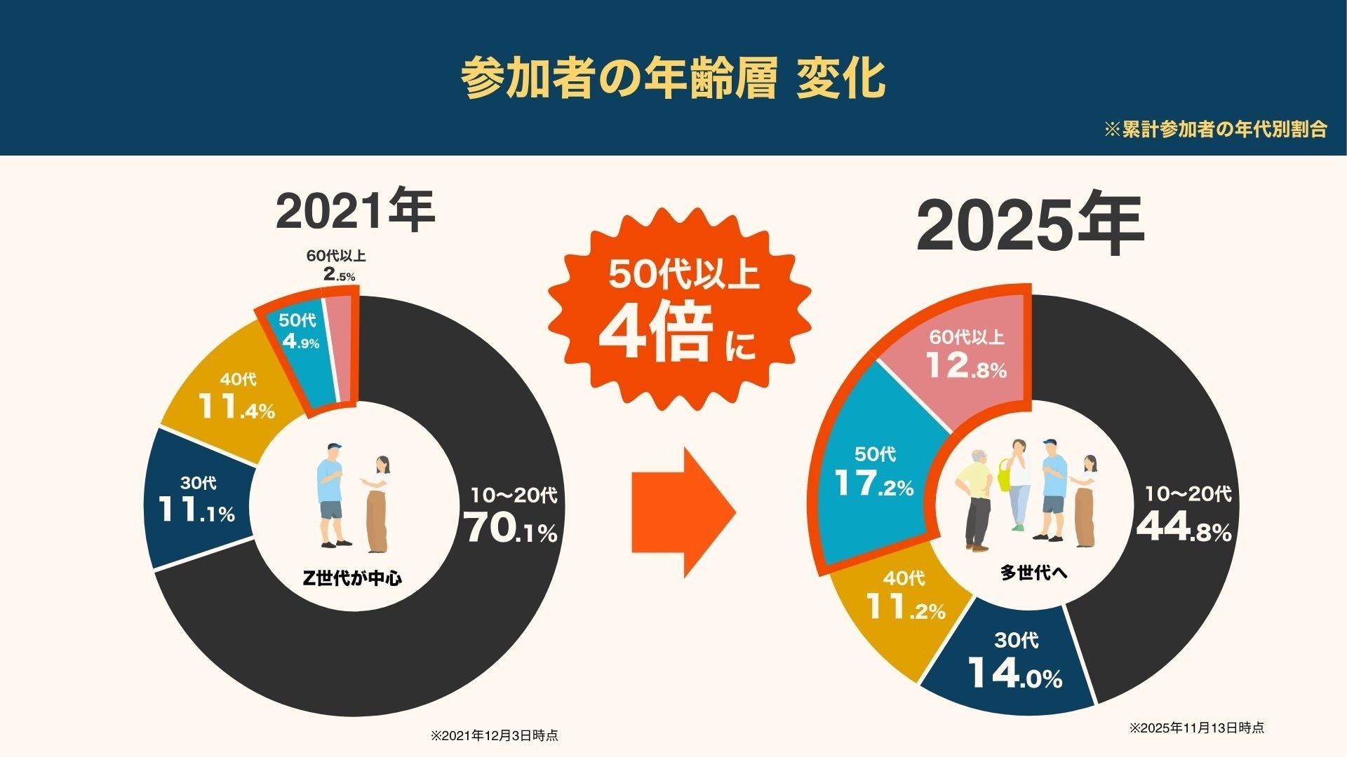 今回の年末年始特集において、特に活躍が期待されるのが50代以上のミドル・シニア層です。 『おてつたび』全参加者に占める50代以上の割合は、2021年の7%から、2025年11月時点では30%まで増加し、約4倍となりました。