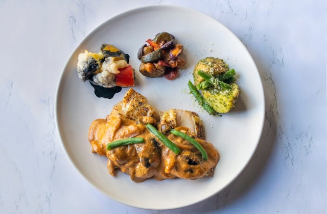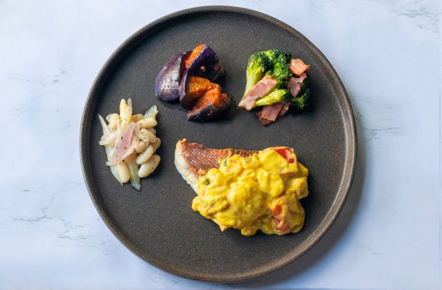 シンプルにグリルした赤魚は、野菜や魚介のうま味が贅沢に詰まった色鮮やかなソースをかけて、見た目にも楽しい一皿に仕上げました。