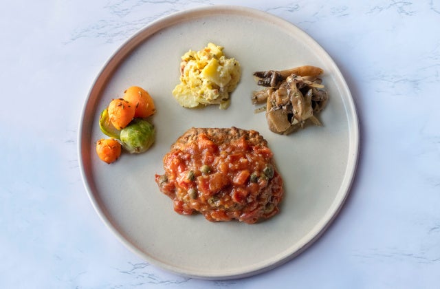 植物由来のおいしさを引き出した動物性原材料不使用のハンバーグは、お肉のような食感とジューシー感が自慢のパティ。スパイスやハーブが効いた、複雑で香り豊かに仕上げたこだわりのトマトソースでお召し上がりください。