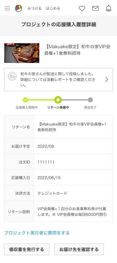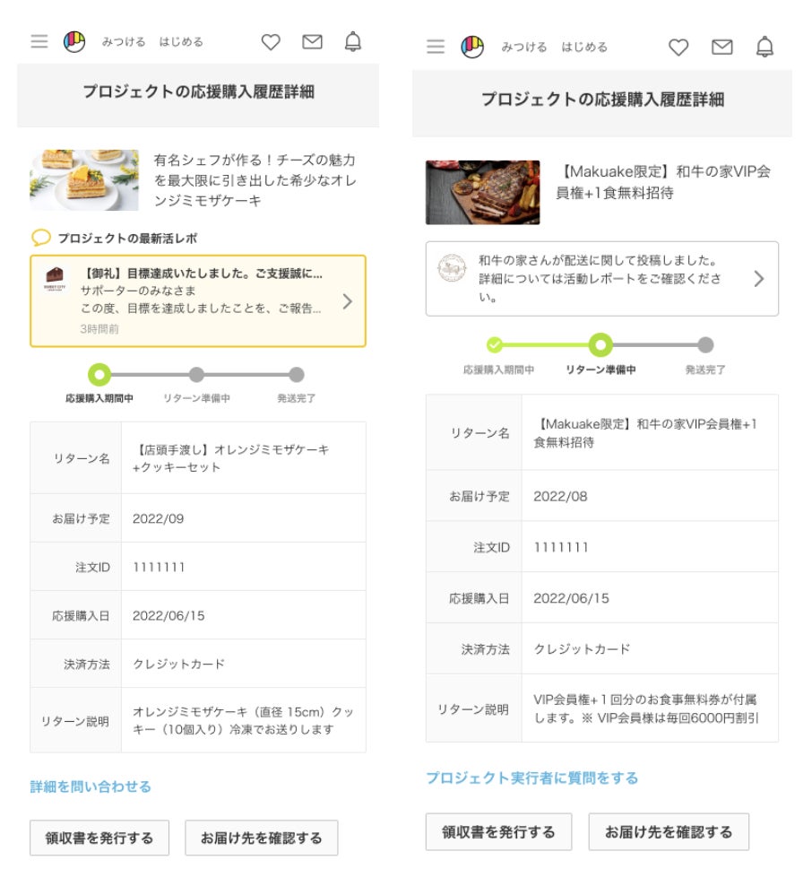本機能は、サポーターのマイページ内「プロジェクトの応援購入履歴」ページに表示されます。自身が応援購入したプロジェクトが現在実施中である場合には「応援購入期間中」、応援購入期間が終了し、プロジェクトを実施した事業者(以下「実行者」)がリターンの製作や発送準備を進めている段階は「リターン準備中」、実行者がすべてのリターンの発送を終えた「発送完了」の3段階に分けて、プロジェクトの状況が表示されます。