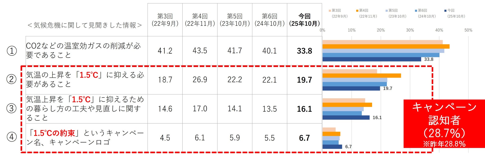 ・25年のキャンペーン期間中の直近6ヶ月(4月~10月中)に、「気温上昇を1.5℃に抑えるべき」というキーワードを含む関連情報に触れたと回答した人は28.7%で、前回(2024年10月)調査の28.8%から変わらず。