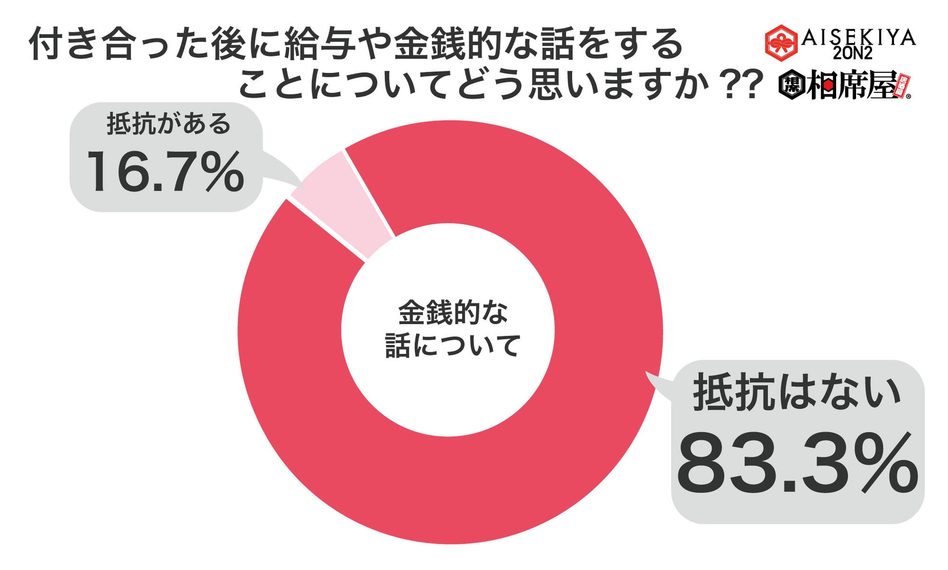 Z世代の男女538人に「付き合う前に給与や金銭的な話をすることについてどう思いますか?」という質問をしたところ、63.8%が抵抗がない、と回答しました。また、「付き合った後に給与や金銭的な話をすることについてどう思いますか?」という質問をしたところ、83.3%が抵抗がない、と回答しました。