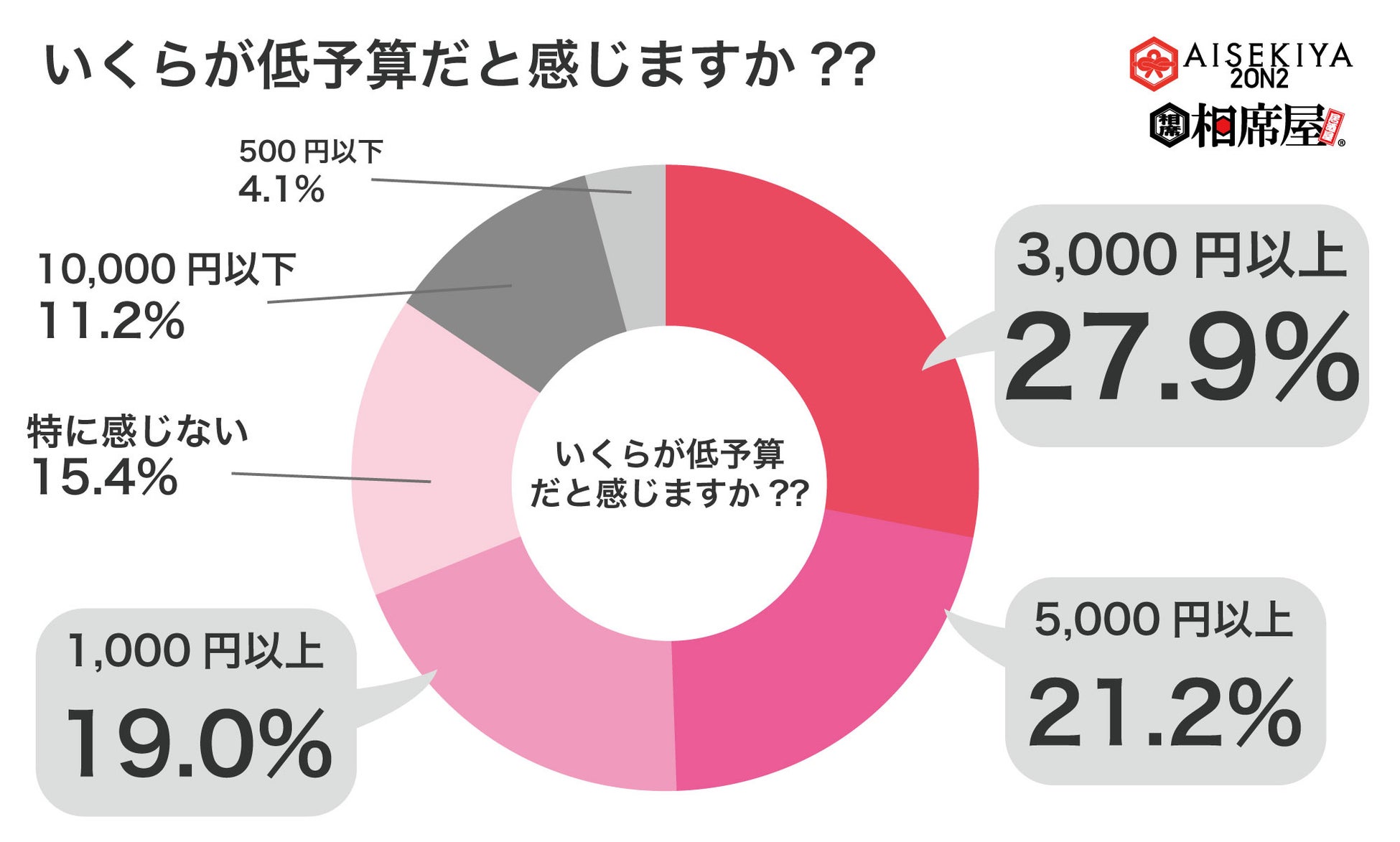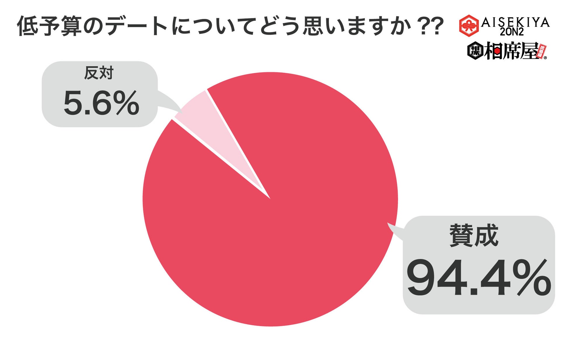 2023年2月にZ世代の男女538人に対して相席屋が行なったZ世代の価値観の調査にて、「低予算のデートについてどう思いますか?」という質問をしたところ、94.4%が賛成と回答しました。そしていくらからが低予算と感じるかについては、3000円以下が27,9%と最多で、5000円以下が21.2%、1000円以下が19%、特に感じないが15.4%、10000円以下が11.2%、500円以下が4.1%となりました。