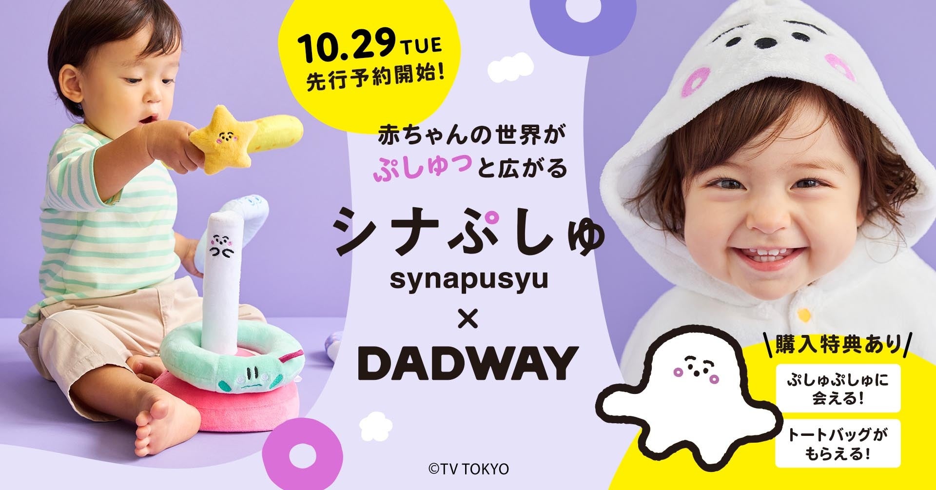 株式会社ダッドウェイ(本社:神奈川県横浜市代表取締役社長:大野 浩人)は、テレビ東京系で放送中の乳幼児向け番組「シナぷしゅ」(毎週月~金曜 あさ7:30)とコラボレートし、商品展開を開始。2024年10月29日よりダッドウェイオンラインストアで予約受付をスタートし、11月29日にダッドウェイ全店で発売いたします。