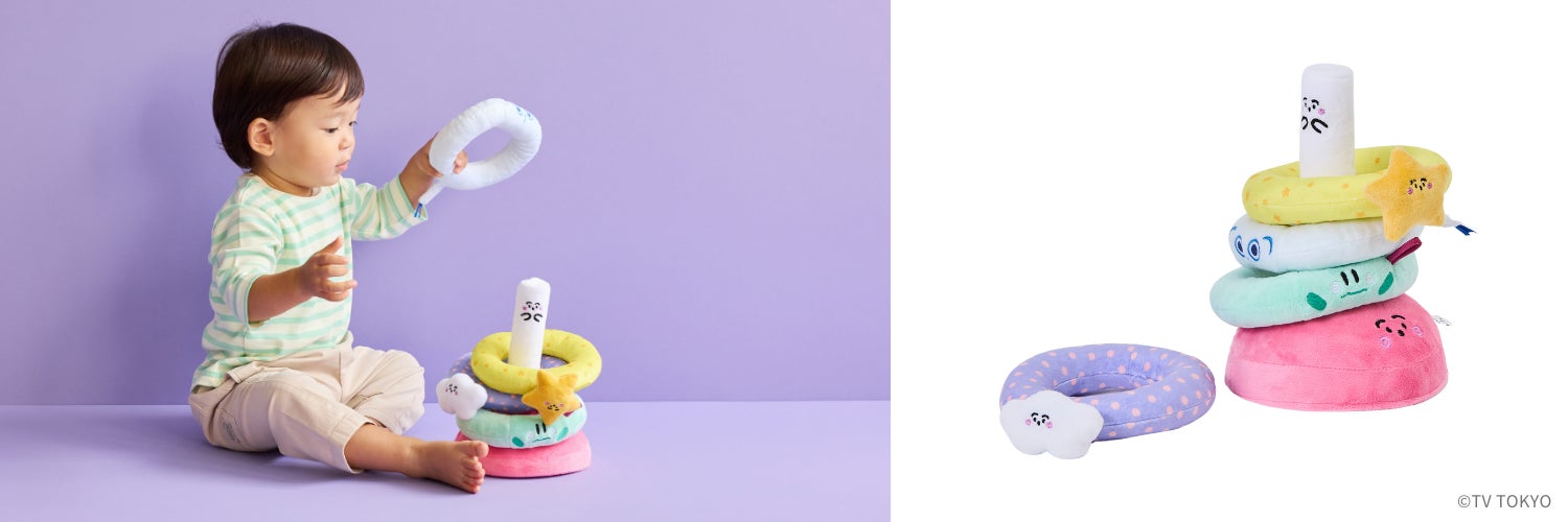 お家あそびにぴったりなふわふわのさわり心地の輪なげ。中央の芯に変身したぷしゅぷしゅに、輪っかを入れてあげましょう。くもと星のぷしゅぷしゅはリンリン鳴るしかけ、にゅうやライオンの輪っかにはループやしっぽのしかけ付きでラトルとしても楽しめます。