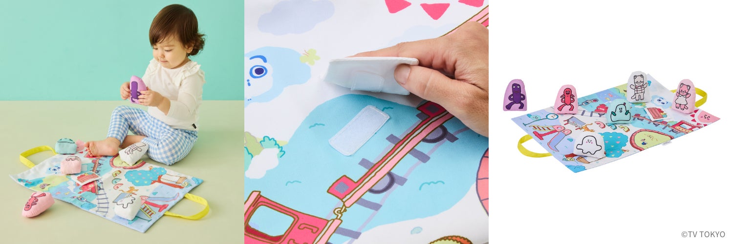 リンリン、カシャカシャ音が鳴る6種類のパーツを使って、ごっこ遊びが楽しめるセット。マットを広げると、公園や野山が広がります。ひーたんみーたんと電車に果物をがっしゃーん!したり、ヨロとレイヒと時計の下で待ち合わせしたりと、ぷしゅぷしゅの世界を満喫できるしかけ。マットを畳むとバッグ型になり、中にパーツを入れて持ち運び可能です。