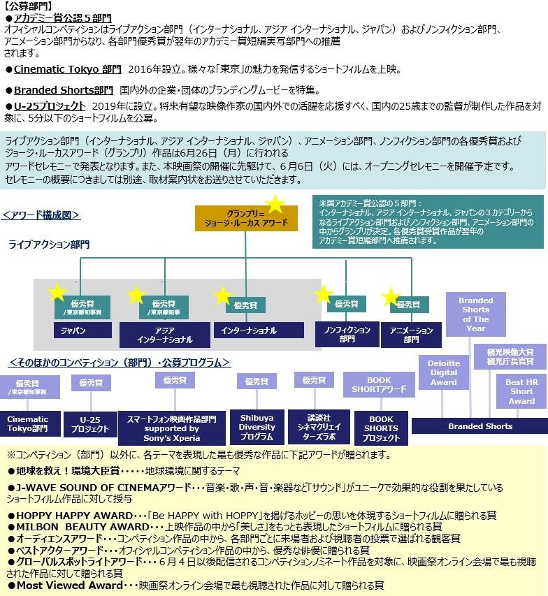 一部の賞は映画祭に向けて事前発表および6月6日(火)のオープニングセレモニーで発表、インターナショナル、アジア、ジャパン、アニメーション、ノンフィクションのカテゴリーからなるオフィシャルコンペティション優秀賞およびジョージ・ルーカスアワード(グランプリ)は6月26日(月)のアワードセレモニーで発表いたします。