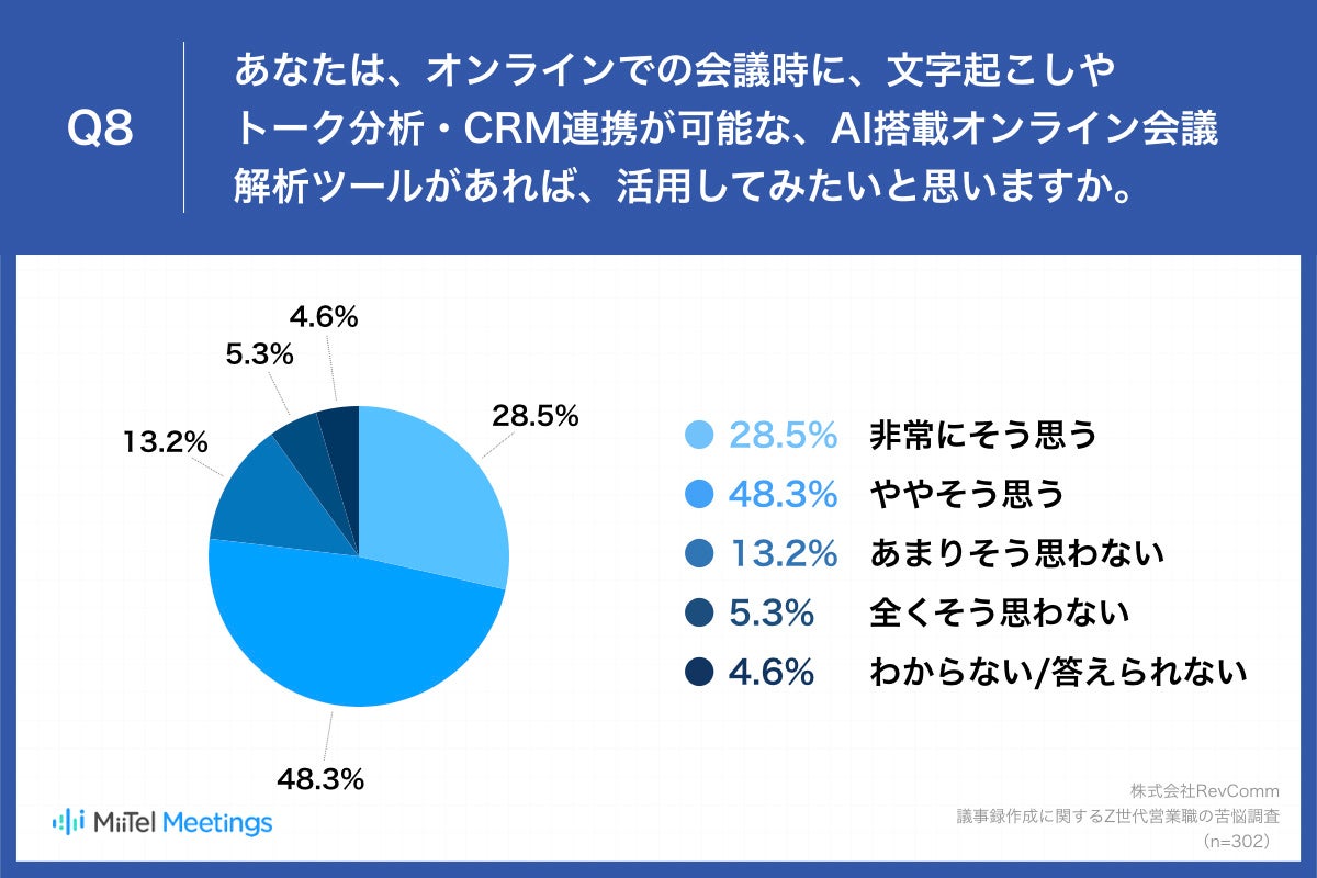「Q8.あなたは、オンラインでの会議時に、文字起こしやトーク分析・CRM連携が可能な、AI搭載オンライン会議解析ツールがあれば、活用してみたいと思いますか。」(n=302)と質問したところ、「非常にそう思う」が28.5%、「ややそう思う」が48.3%という回答となりました。