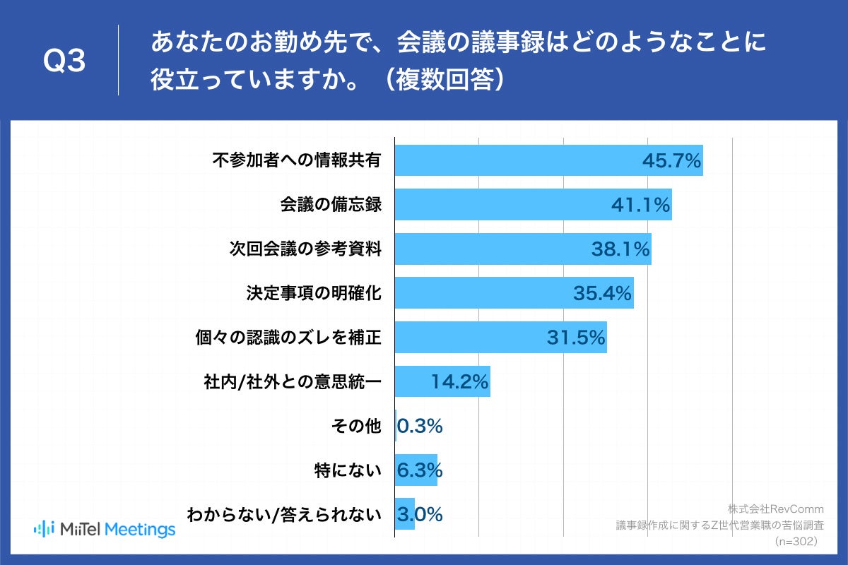 「Q3.あなたのお勤め先で、会議の議事録はどのようなことに役立っていますか。(複数回答)」(n=302)と質問したところ、「不参加者への情報共有」が45.7%、「会議の備忘録」が41.1%、「次回会議の参考資料」が38.1%という回答となりました。