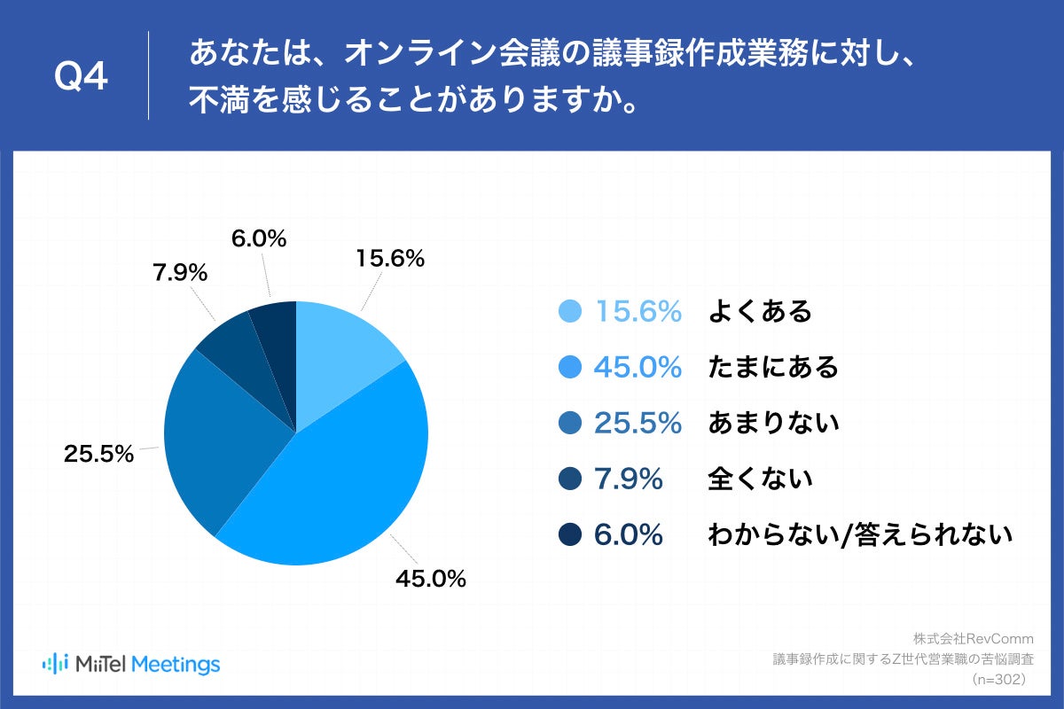 「Q4.あなたは、オンライン会議の議事録作成業務に対し、不満を感じることがありますか。」(n=302)と質問したところ、「よくある」が15.6%、「たまにある」が45.0%という回答となりました。