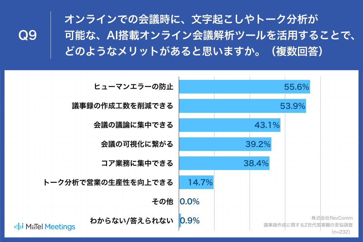 Q8で「非常にそう思う」「ややそう思う」と回答した方に、「Q9.オンラインでの会議時に、文字起こしやトーク分析が可能な、AI搭載オンライン会議解析ツールを活用することで、どのようなメリットがあると思いますか。(複数回答)」(n=232)と質問したところ、「ヒューマンエラーの防止」が55.6%、「議事録の作成工数を削減できる」が53.9%、「会議の議論に集中できる」が43.1%という回答となりました。