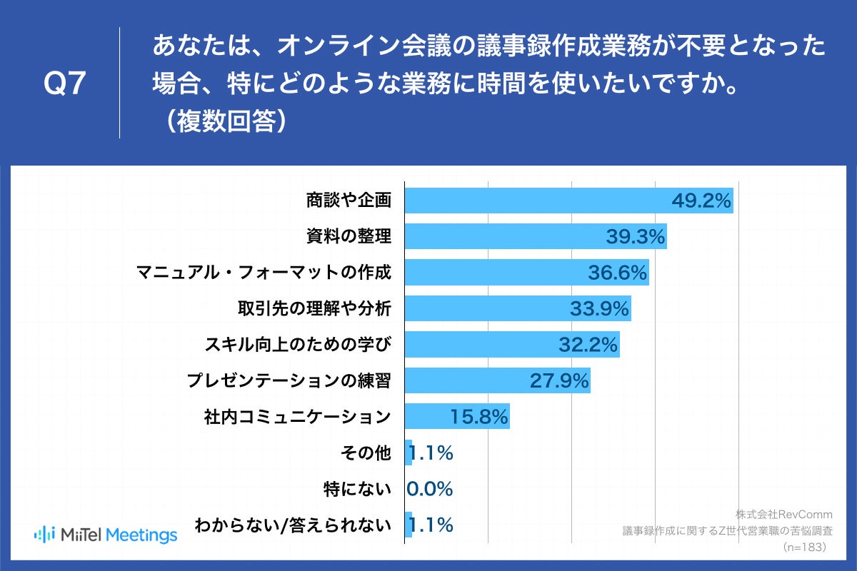 Q4で「よくある」「たまにある」と回答した方に、「Q7.あなたは、オンライン会議の議事録作成業務が不要となった場合、特にどのような業務に時間を使いたいですか。(複数回答)」(n=183)と質問したところ、「商談や企画」が49.2%、「資料の整理」が39.3%、「マニュアル・フォーマットの作成」が36.6%という回答となりました。