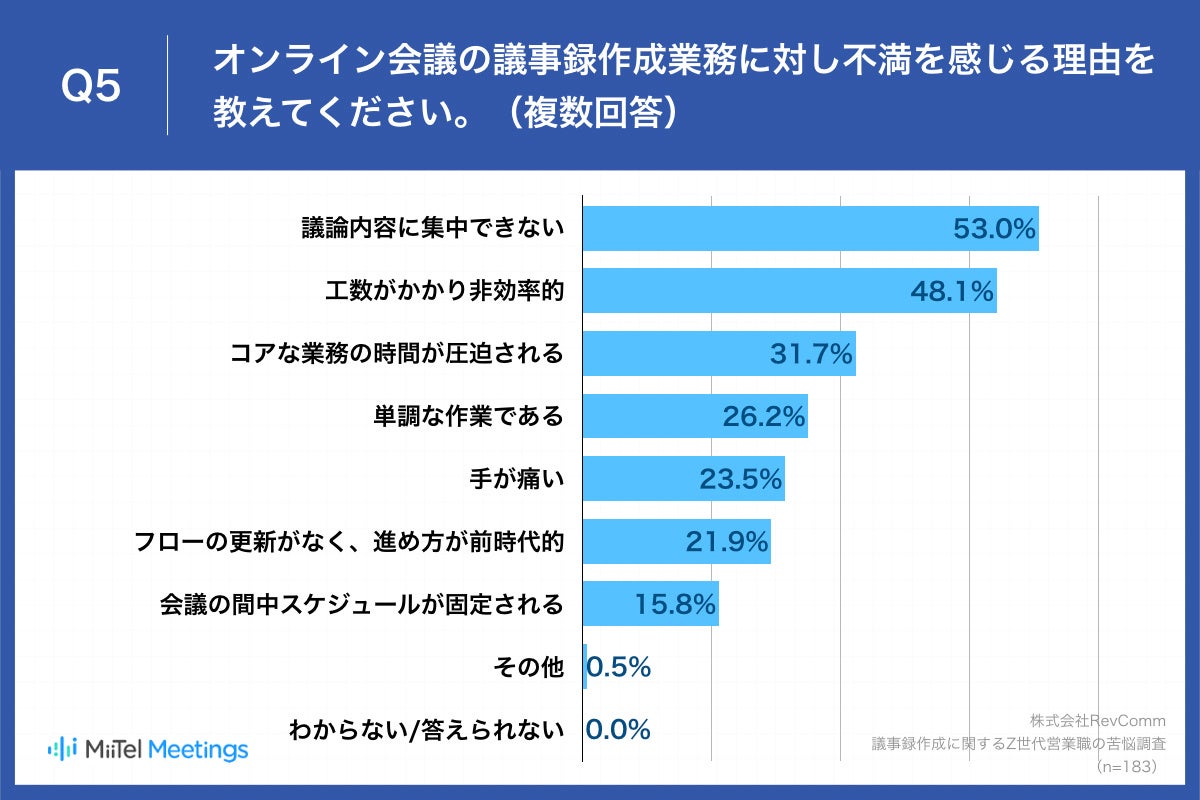 Q4で「よくある」「たまにある」と回答した方に、「Q5.オンライン会議の議事録作成業務に対し不満を感じる理由を教えてください。(複数回答)」(n=183)と質問したところ、「議論内容に集中できない」が53.0%、「工数がかかり非効率的」が48.1%、「コアな業務の時間が圧迫される」が31.7%という回答となりました。
