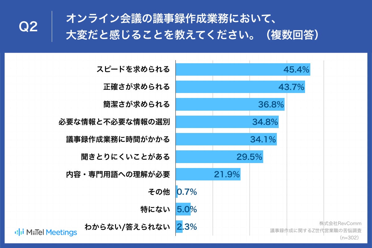 「Q2.オンライン会議の議事録作成業務において、大変だと感じることを教えてください。(複数回答)」(n=302)と質問したところ、「スピードを求められる」が45.4%、「正確さが求められる」が43.7%、「簡潔さが求められる」が36.8%という回答となりました。