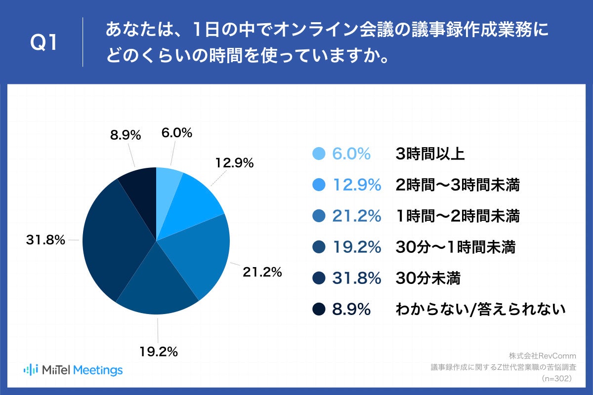 「Q1.あなたは、1日の中でオンライン会議の議事録作成業務にどのくらいの時間を使っていますか。」(n=302)と質問したところ、「1時間~2時間未満」が21.2%、「30分~1時間未満」が19.2%という回答となりました。