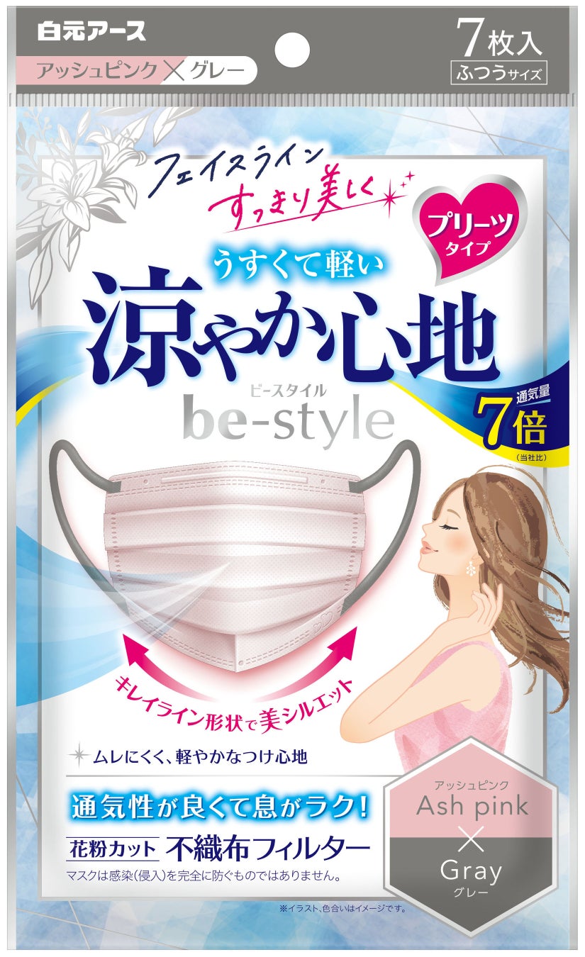 「ビースタイル プリーツタイプ 涼やか心地」は、ムレにくく、軽やかなつけ心地のエアスルー製法の口もと素材を採用し、通気量が従来の不織布マスクの7倍※2のマスクです。2018年の発売以降、着用時のムレが気になる季節に、爽やかで呼吸が楽になるマスクとして好評をいただいています。また、形にもこだわったキレイライン形状で、美しいシルエットを叶えるマスクです。アゴ部分の縦プリーツと、両サイドの引き上げタックによりフェイスラインがきれいに見えます。加えて、プリーツトップの位置を上げることにより、プリーツが上から広がり横顔もすっきりきれいです。