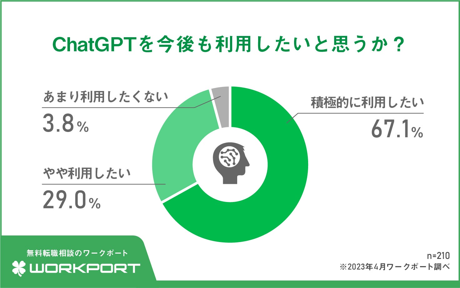 さらに、ChatGPTの利用経験者に今後もChatGPTを利用したいと思うか聞いたところ、「積極的に利用したい」(67.1%)、「やや利用したい」(29.0%)が合わせて96.1%でした。ChatGPTを使った人のほとんどが今後も利用したいと感じているようです。