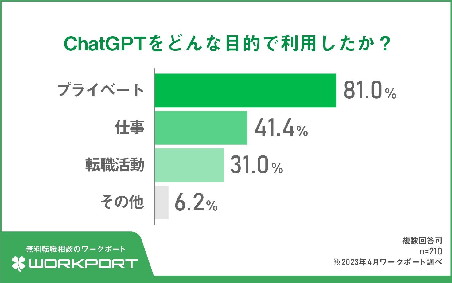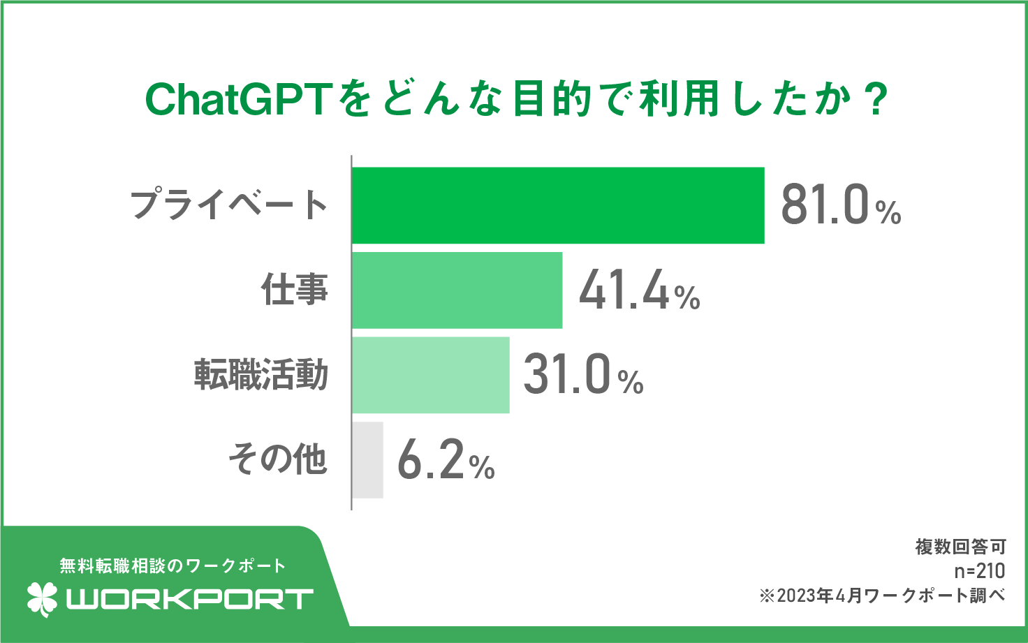 ChatGPTを使ったことがあると回答した人にどんな目的で利用したか聞いたところ、「プライベート」が81.0%で最多となりました。次いで「仕事」が41.4%、「転職活動」と回答した人は31.0%でした。