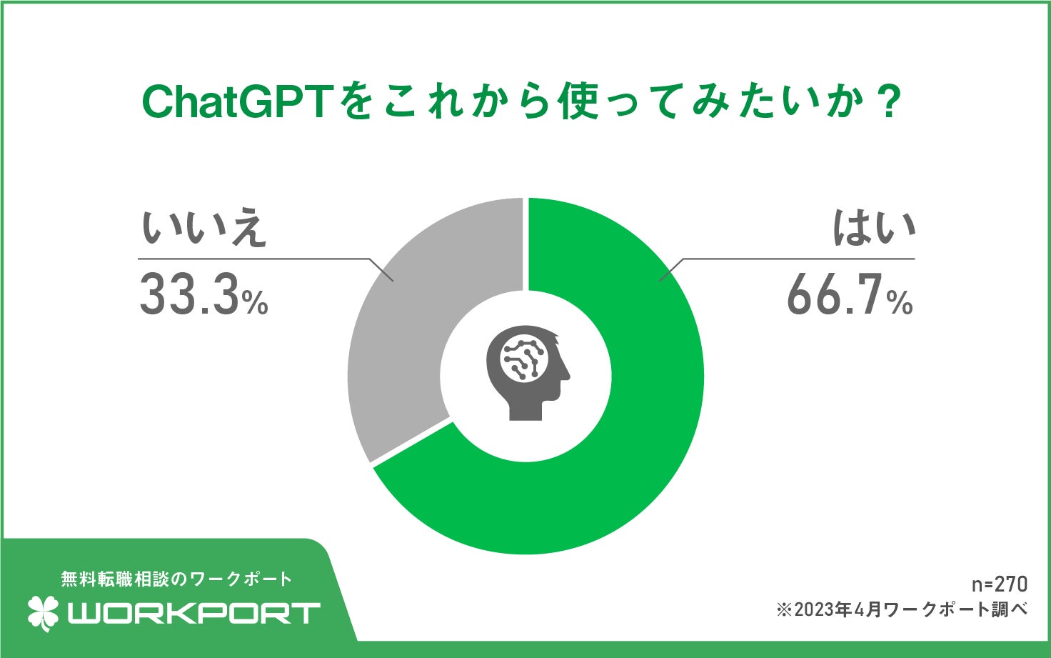 続いて、ChatGPTを利用したことがないと回答した人にChatGPTをこれから使ってみたいと思うか聞いたところ、「使ってみたい」と答えた人は66.7%でした。ChatGPTをまだ利用していない層も、7割近くはChatGPTの利用に前向きな姿勢を持っていることがわかりました。