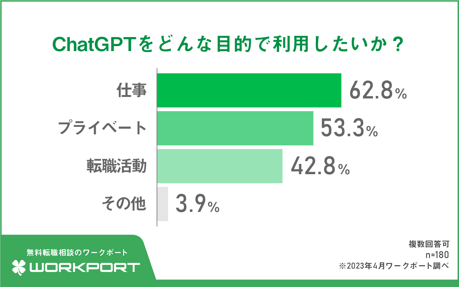 ChatGPTをこれから使ってみたいと回答した人にChatGPTをどんな目的で利用したいか聞いたところ、「仕事」が62.8%、「プライペート」が53.3%となり、「転職活動」と回答した人は42.8%でした。