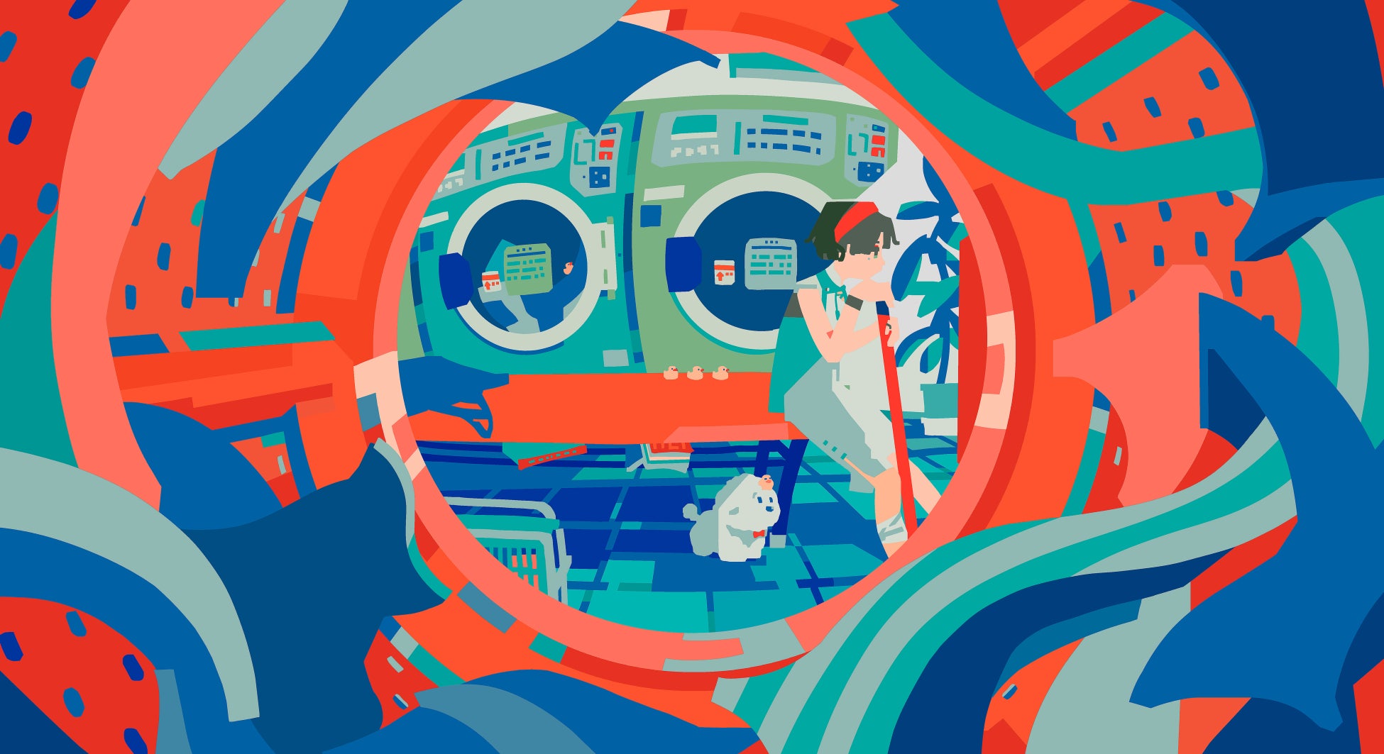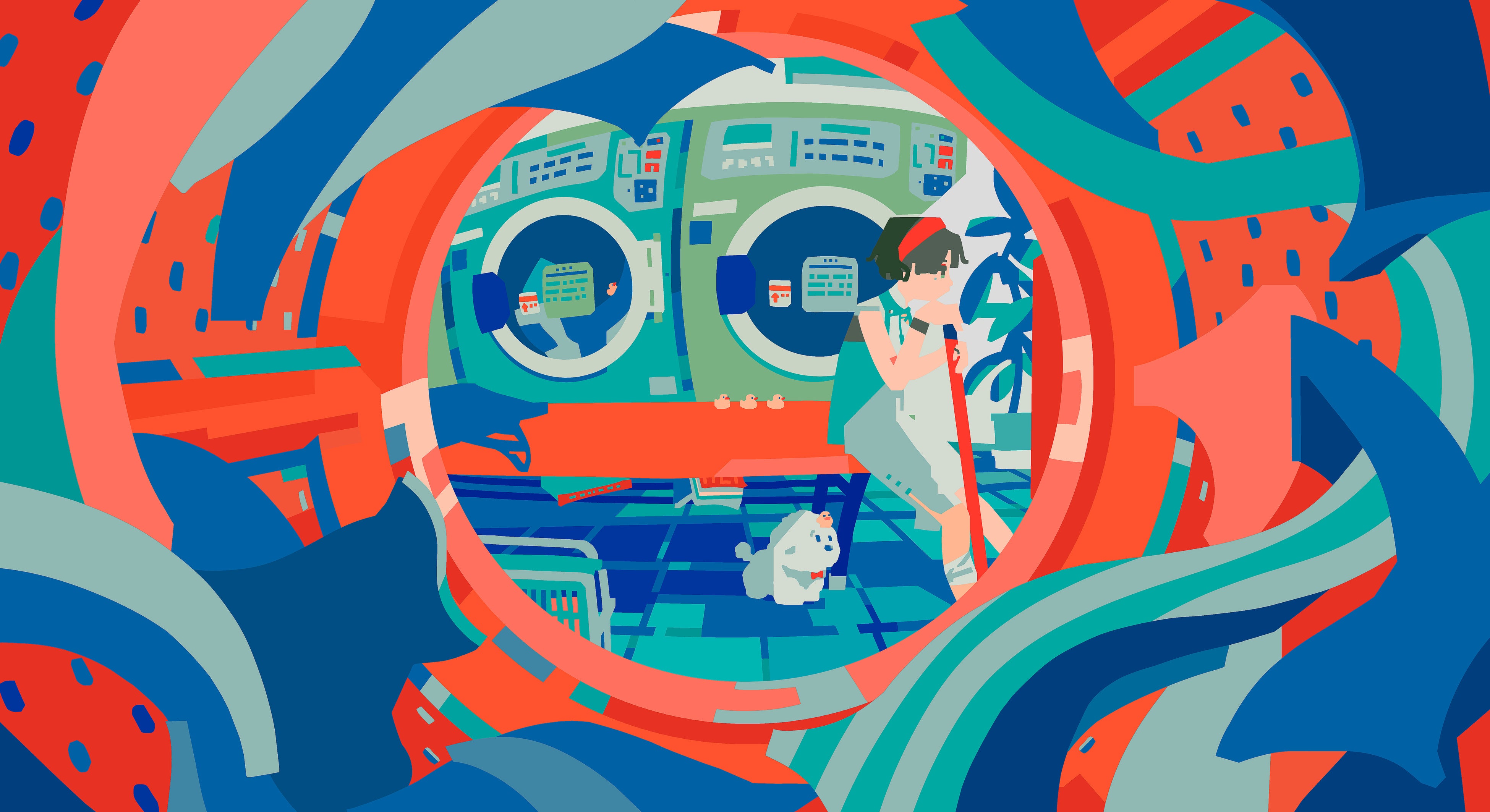 「洗濯機の中から店内をのぞき込むこの景色が、物語のはじまりのようでワクワクする。女の子と相棒のワンちゃんは、一体何を考えているのだろう? 想像する楽しみが一枚の絵の中に広がっている。デフォルメされた世界も、単純化されているようでありながら、細部にわたって手抜かりがなく、何より遊び心に溢れている。この人の得がたいデザインセンスに強く惹かれました」