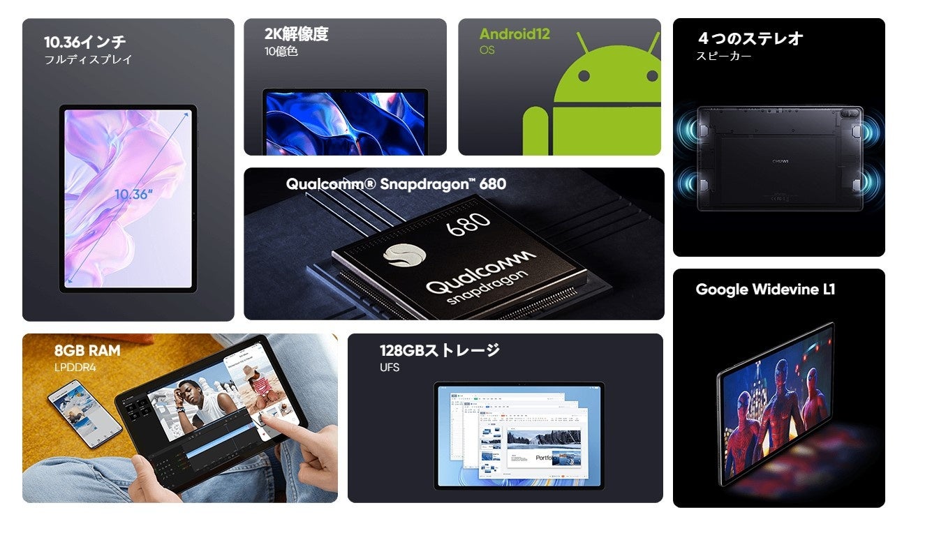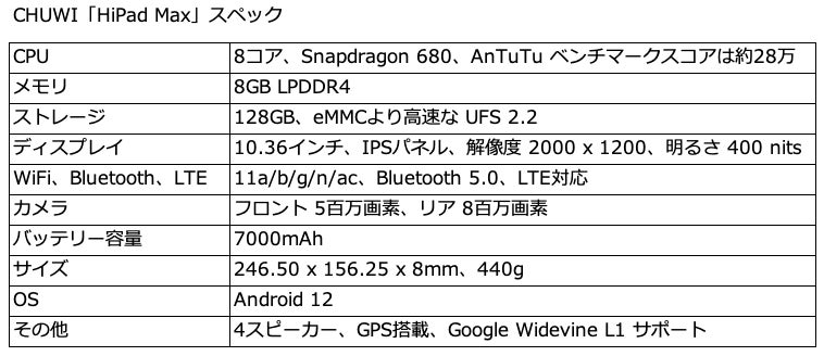 なお、LTE対応にGPS搭載、カメラはリア 8百万画素・フロント 5百万画素、7000mAhの大容量バッテリーを搭載しつつも 440gと軽量、OSはAndroid 12と、その他のスペック・機能も充実しています。