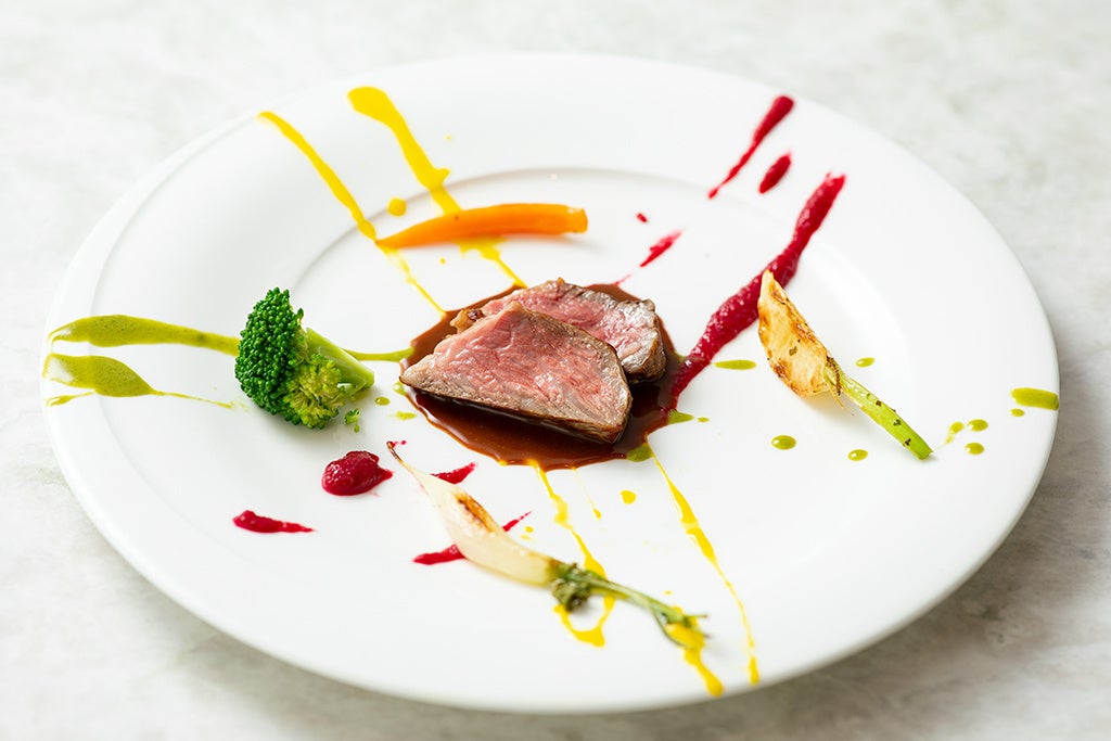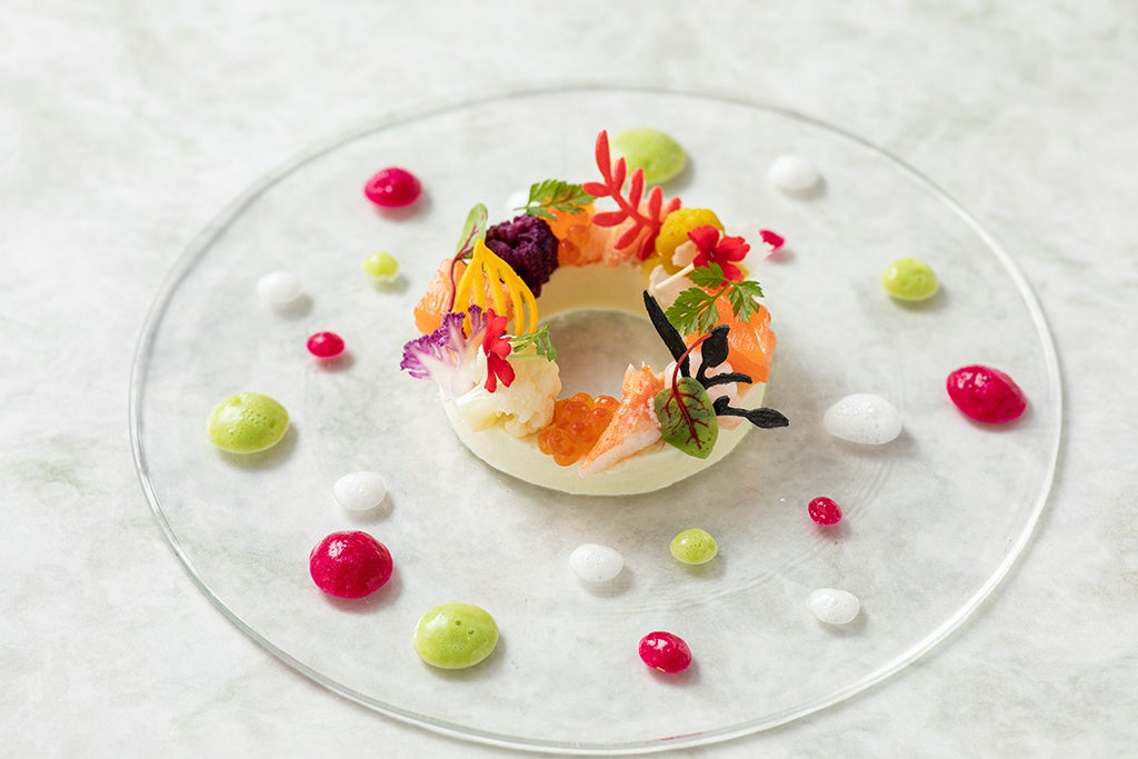 口の中で様々な味わいが楽しめる“北海道産蝦夷鹿のパテとフォアグラ”を始まりの一皿に、前菜には 蟹やサーモンなどの魚介をカラフルな味わいが異なるカリフラワーとビーツのエスプーマとともに。