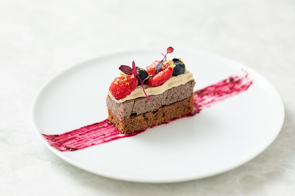 そして思い出に残るディナーのデザートには、バラの香りを付けた苺のジュレを閉じ込めたチョコレートムースが最後を飾ります。