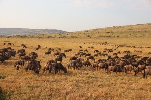 ウガンダでの旅程を終え、ケニアのマサイマラ保護区に向かいます。ここでは、広大な草原が広がるサバンナの景観を撮影しました。この時期はヌーの大群が訪れており、チーターがヌーの子どもを襲う光景を目にしました。狩りは成功したように見えましたが、母親の反撃で子どもは護られました。
