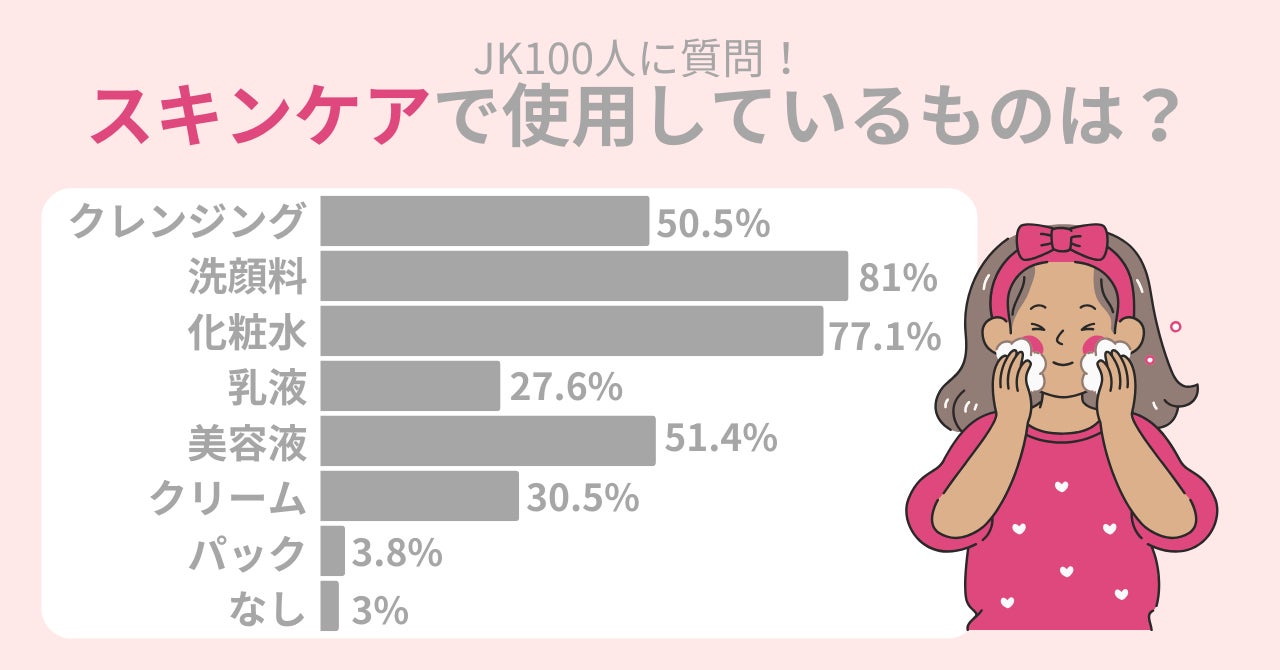 JKのスキンケア事情を調査したところ、81%の女子高校生が「洗顔料」を使用し、77%の女子高校生が「化粧水」を使用していることがわかりました。