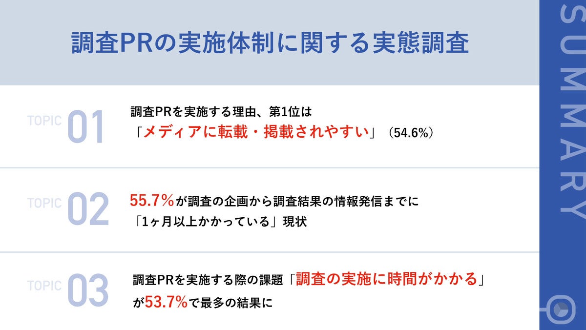 今回の調査では、調査PRが、企業のブランディングやリード獲得に繋がるために有用である一方で、「時間・コスト・人」が大きくかかる手法ということがわかりました。本音として、調査の実施を外注したい声も挙がっていることから、効果的に外注を活用しつつ、スピーディーな調査PRを行うことで、より一層効果的なPR効果とリード獲得に繋げられるのではないでしょうか。