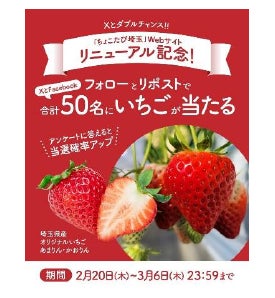 サイトリニューアルを記念して、ちょこたび埼玉SNS(FB,X)にて埼玉県オリジナルいちごの「あまりん」や「かおりん」が当たるキャンペーンを実施します。