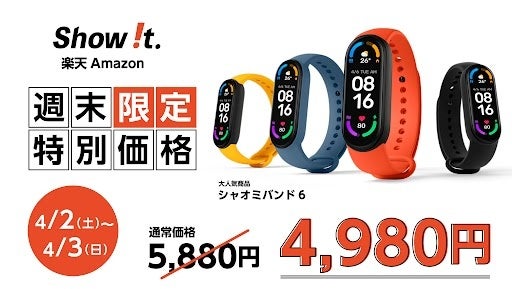 Amazon「Show !t」と楽天「Show !t」にて、4月2日(土)、3日(日)の週末限定セール実施決定。シャオミのバンド6通常価格5,880円を4,980円の特別価格で販売します。