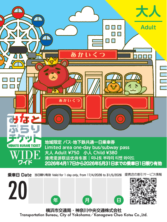 新横浜駅と都心臨海部の横浜駅、桜木町駅間を乗換えなしで移動できる横浜市営地下鉄と、ベイエリア周辺の横浜市営バス・神奈中バスが利用できる便利でお得な1日乗車券「みなとぶらりチケットワイド」。昨年に引き続き、都心臨海部の観光地を巡る観光スポット周遊バス「あかいくつ」とTBがコラボした特別デザインを、数量限定で販売します!