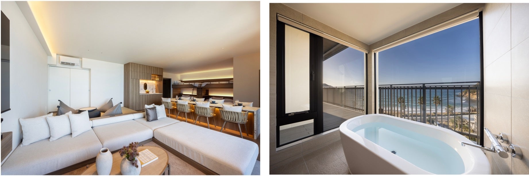 「seven x seven 糸島」は、福岡県福岡市の西端に位置する、シーサイドリゾート地「糸島半島・二見ヶ浦地区」に開業。福岡県・糸島エリアでは初となる当ホテルは、全47室がオーシャンビュー。ホテルのデザインは、イギリス・ロンドンを拠点に活動する建築デザインチーム「PDP LONDON LLP」が手がけ、玄海国定公園内の自然とターコイズブルーの海を一望できるこのロケーションを生かし、ホテルをニュートラルなカラーに限定することで、海の眺望と自然を際立たせるデザインを取り入れました。室内の自然光の反射を最大限に生かすため、明るい石造りの天板を採用や、温かみのある木目調を基調とし、客室内も素晴らしい景色が堪能できるようにデザインされリラックスなムードを演出します。